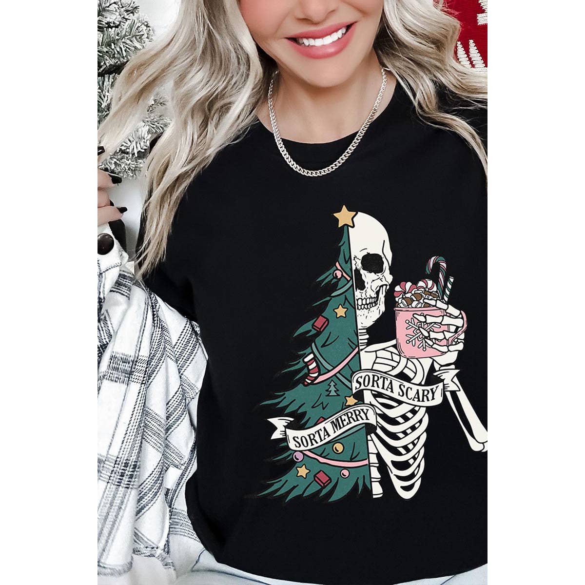 SORTA MERRY,SORTA SCARY,CHRISTMAS,SKELETON UNISEX SHORT SLEEVE,GRAPHIC TEE,GRAPHIC TSHIRTS,TSHIRTS,TEES 100%COTTON,HEATHER(52%COTTON,48%POLY),ATH.HEATHER,BLACK HEATHER(90%COTTON,10%POLY) NICARAGUA