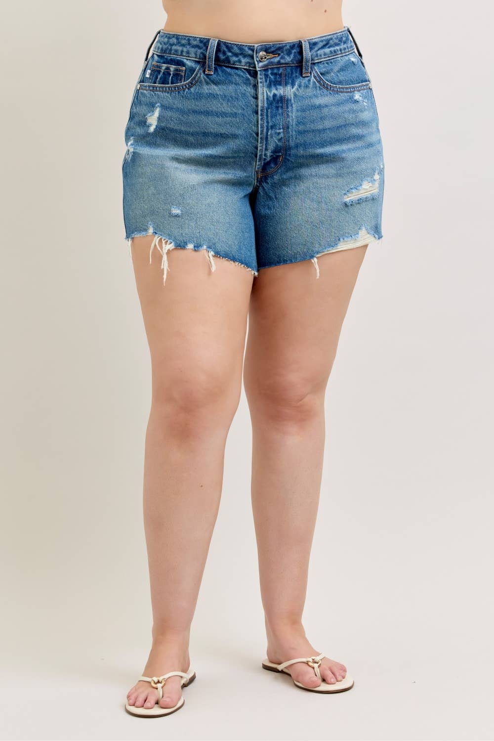 The HW Rigid Magic Cut Off Short - PLUS from Judy Blue Jeans is a perfect addition to your wardrobe. Designed for the plus-size woman, these high-waisted shorts offer a comfortable, everyday casual look. Crafted from a blend of cotton and spandex, they feature a medium wash that's versatile for any outfit. The front panel is 100% cotton, while the back panel combines cotton, poly, and spandex for a touch of stretch. Hand wash recommended to maintain its quality. With a length that hits at the thigh, these shorts encapsulate the laid-back, effortlessly chic vibe.