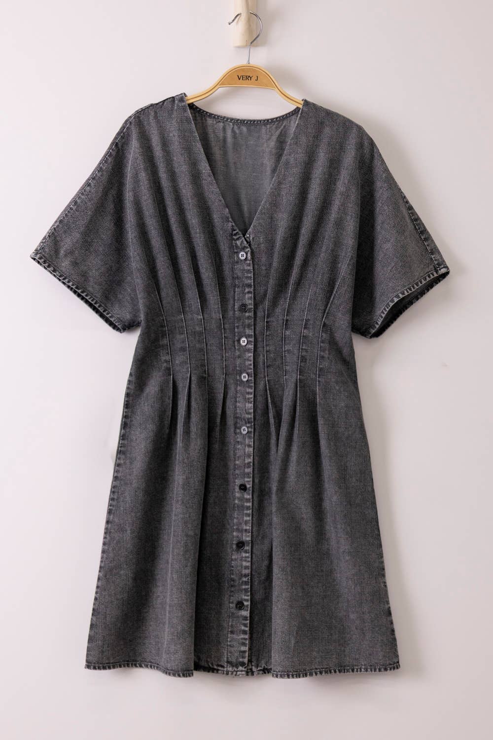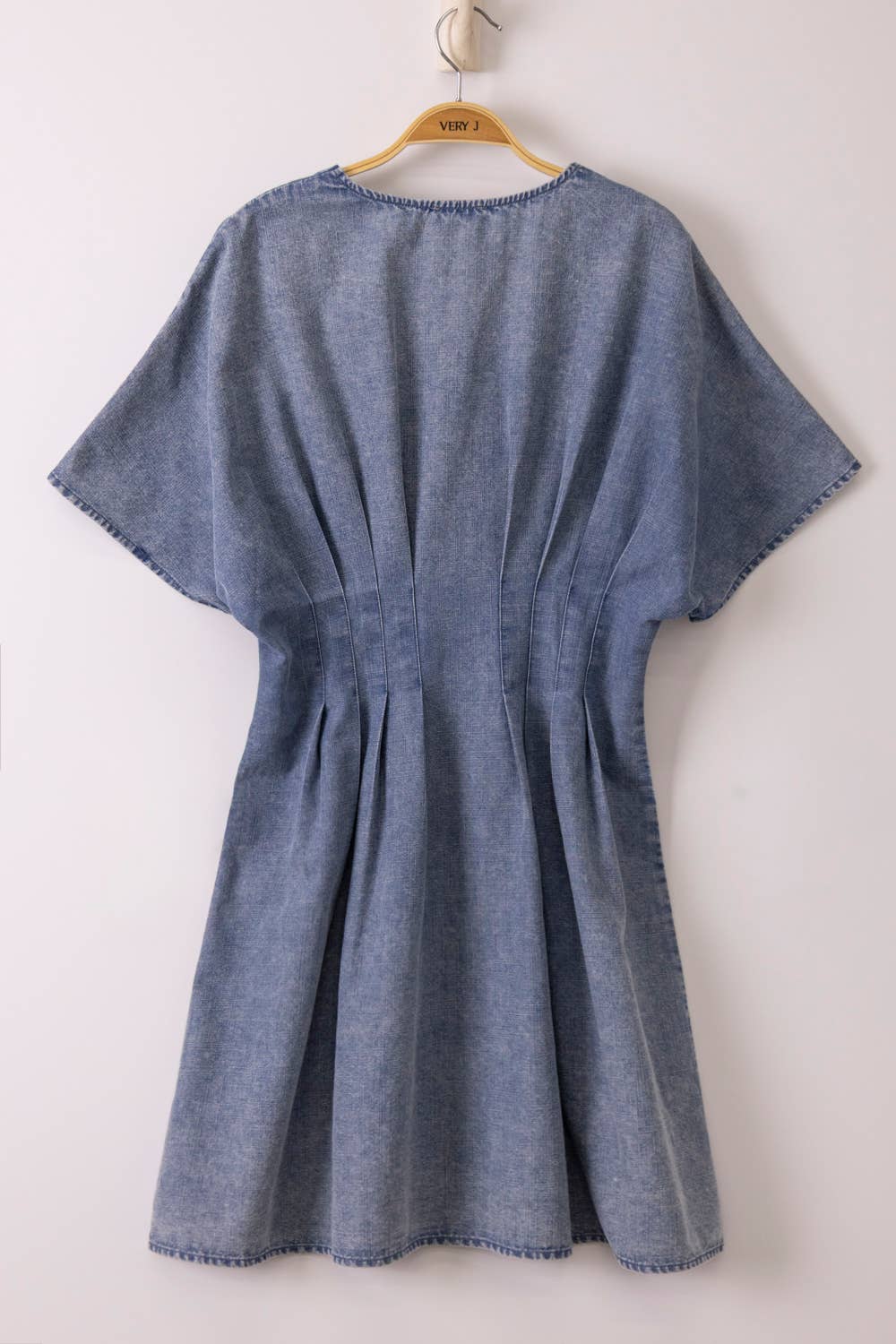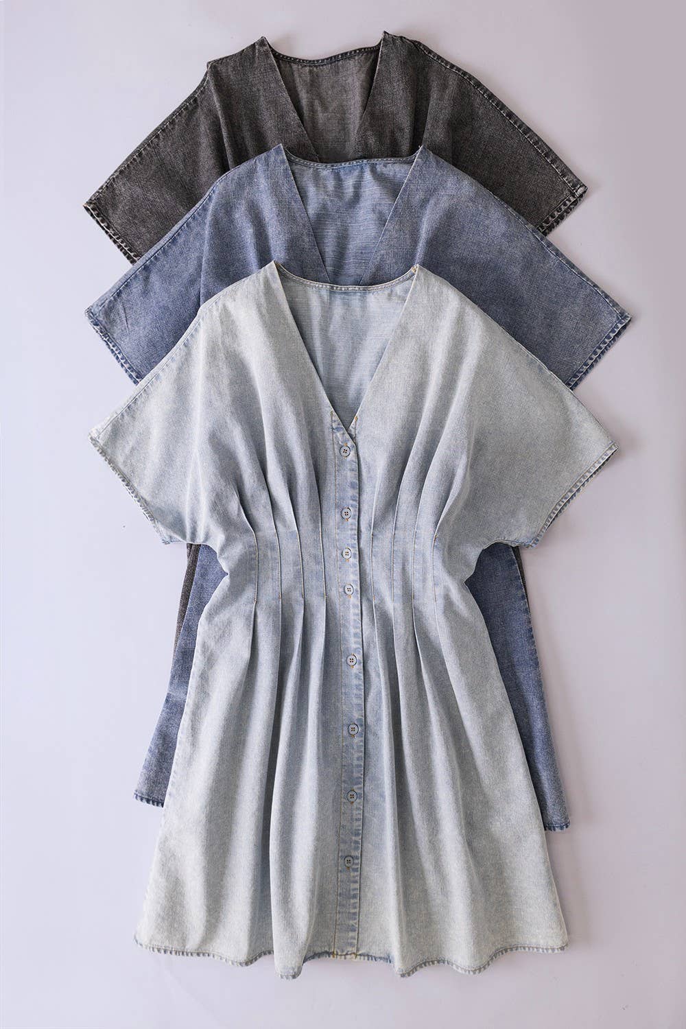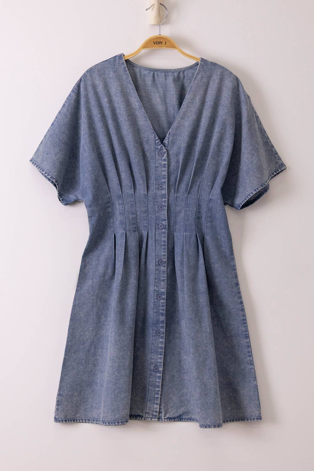 - Pintuck Detail Mineral Washed Chambray Mini Dress - V-Neck - Short Sleeve - Button Down