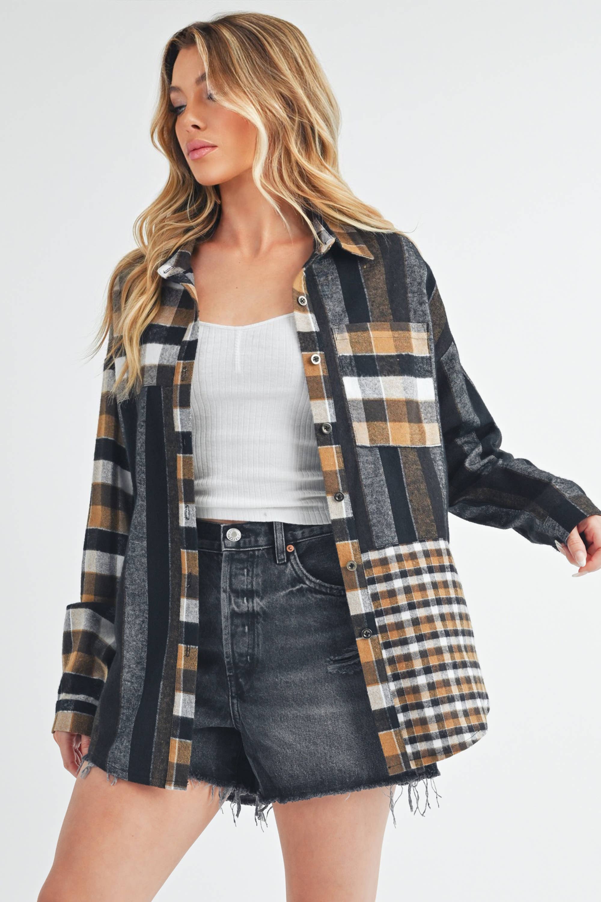 Harlow Plaid flannel shirt combines comfort and style with its vibrant multi-plaid checkered pattern. The loose fit ensures a relaxed silhouette, perfect for casual days or layering. Ideal for lounging, errands, or outings, it offers warmth and timeless appeal.