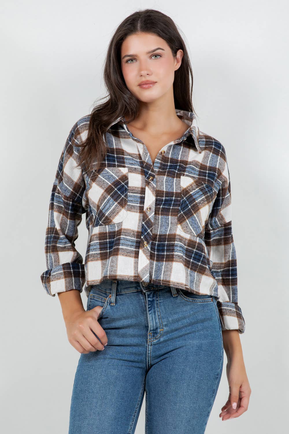 Soft brushed flannel shirt with a relaxed oversized fit. Features a classic plaid pattern with front button closure, drop shoulders, and long sleeves with cuff detail. Designed with double chest pockets and a slightly cropped hem for a laid-back modern look. Perfect for layering over tanks or tees for a cozy casual style.