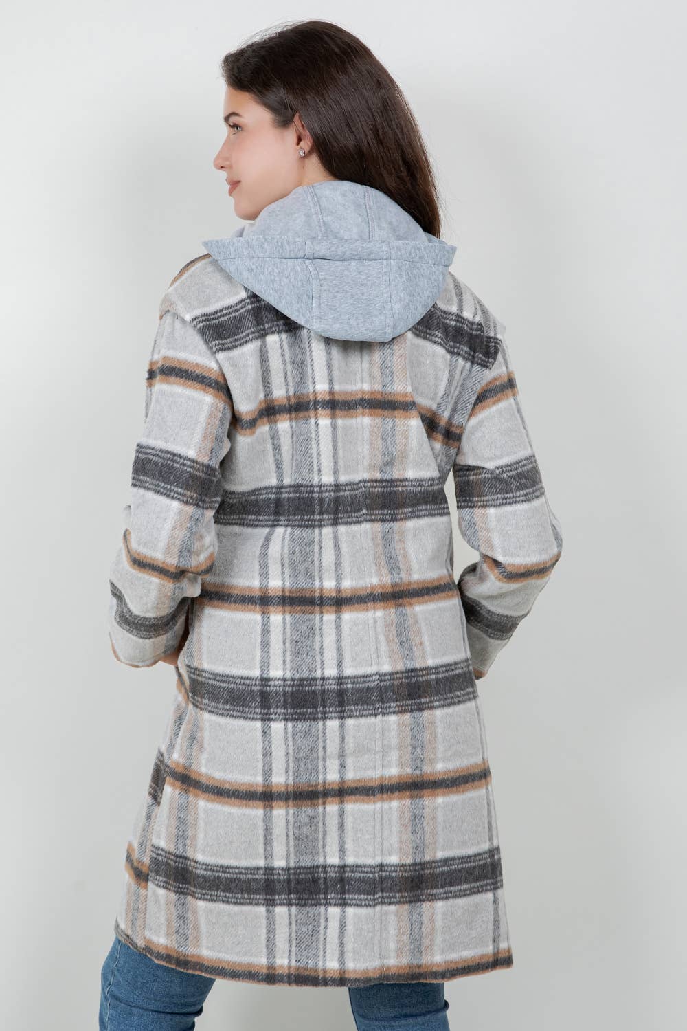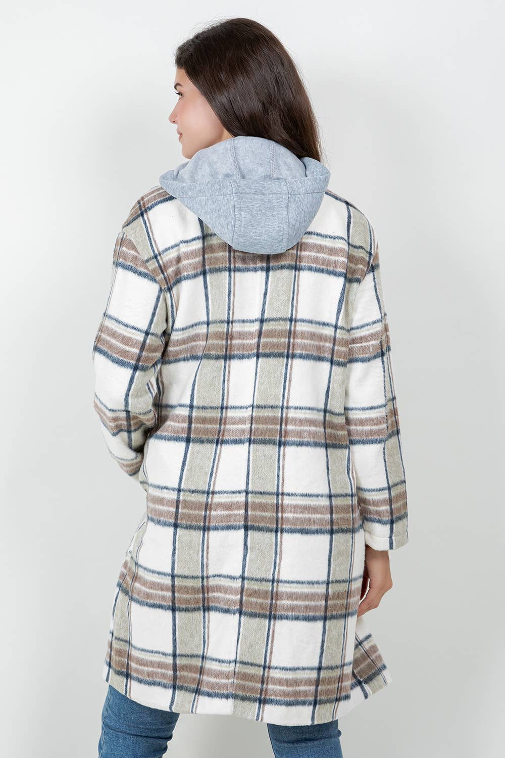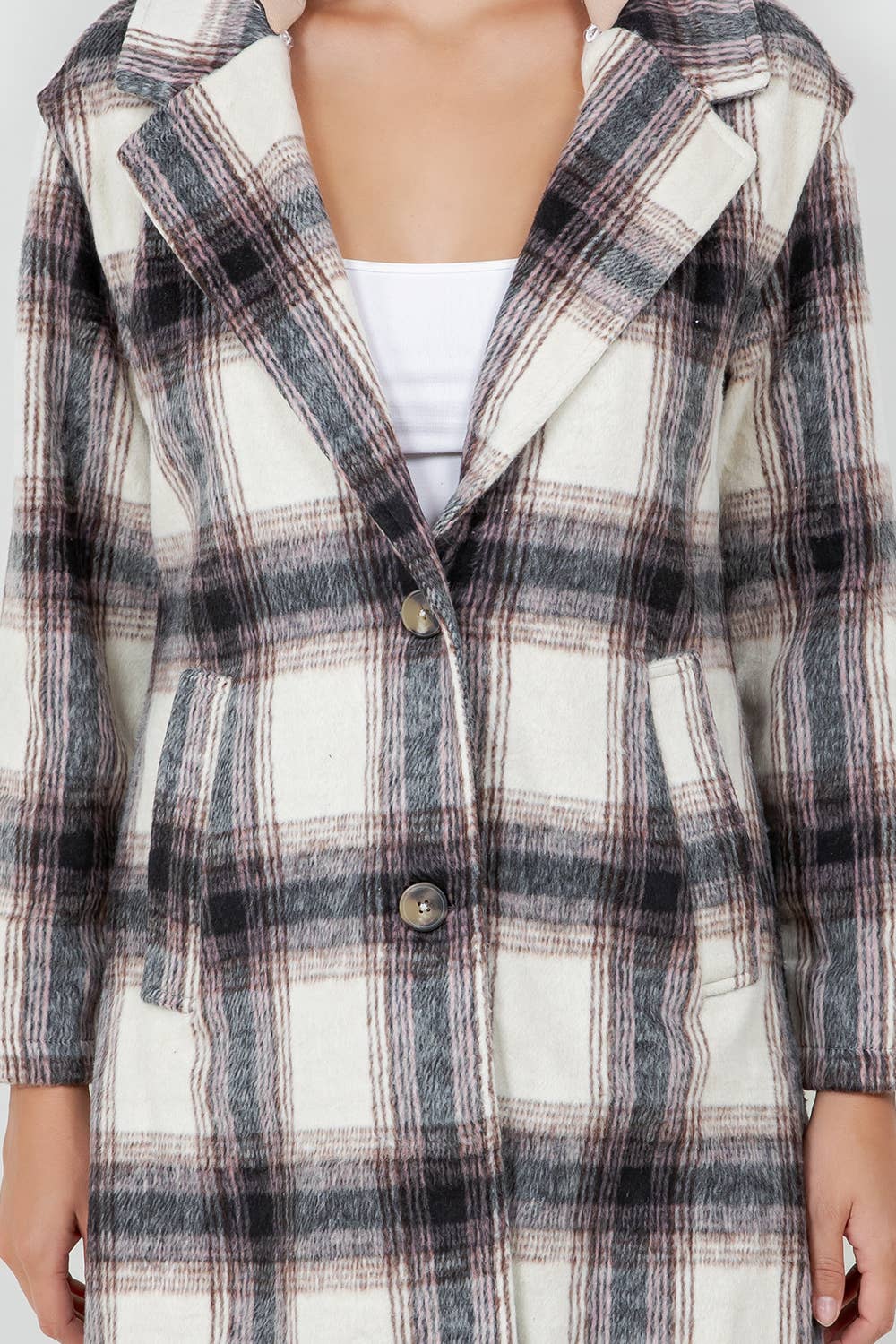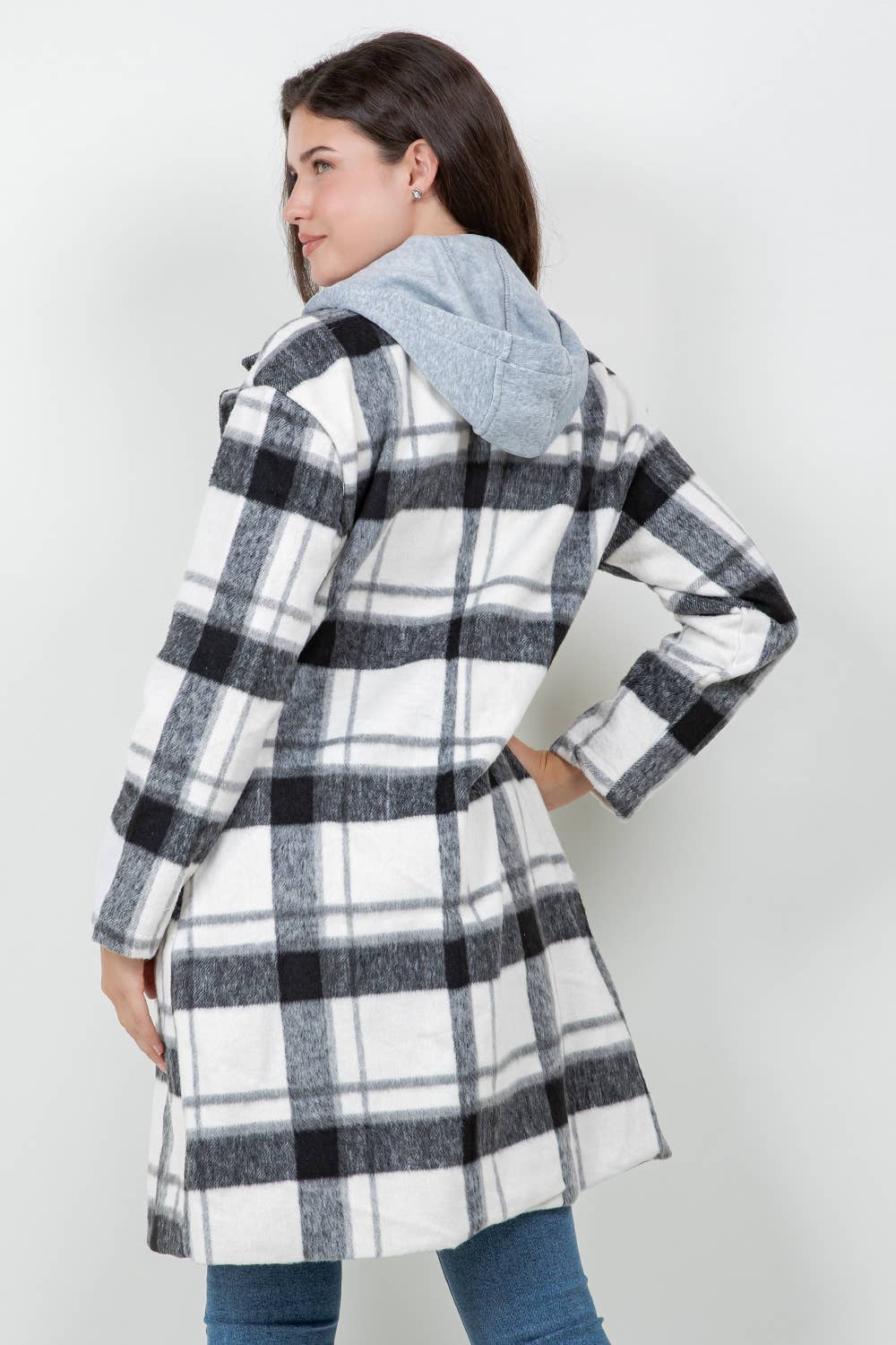 A modern twist on a timeless silhouette. This longline plaid coat is designed with a tailored notch collar and a detachable knit hood that adds a casual layered look. It features a double-button front closure, side welt pockets, fully lined and a soft brushed finish for cozy comfort. Wear it with the hood for an off-duty vibe or remove it for a polished, classic outerwear style.