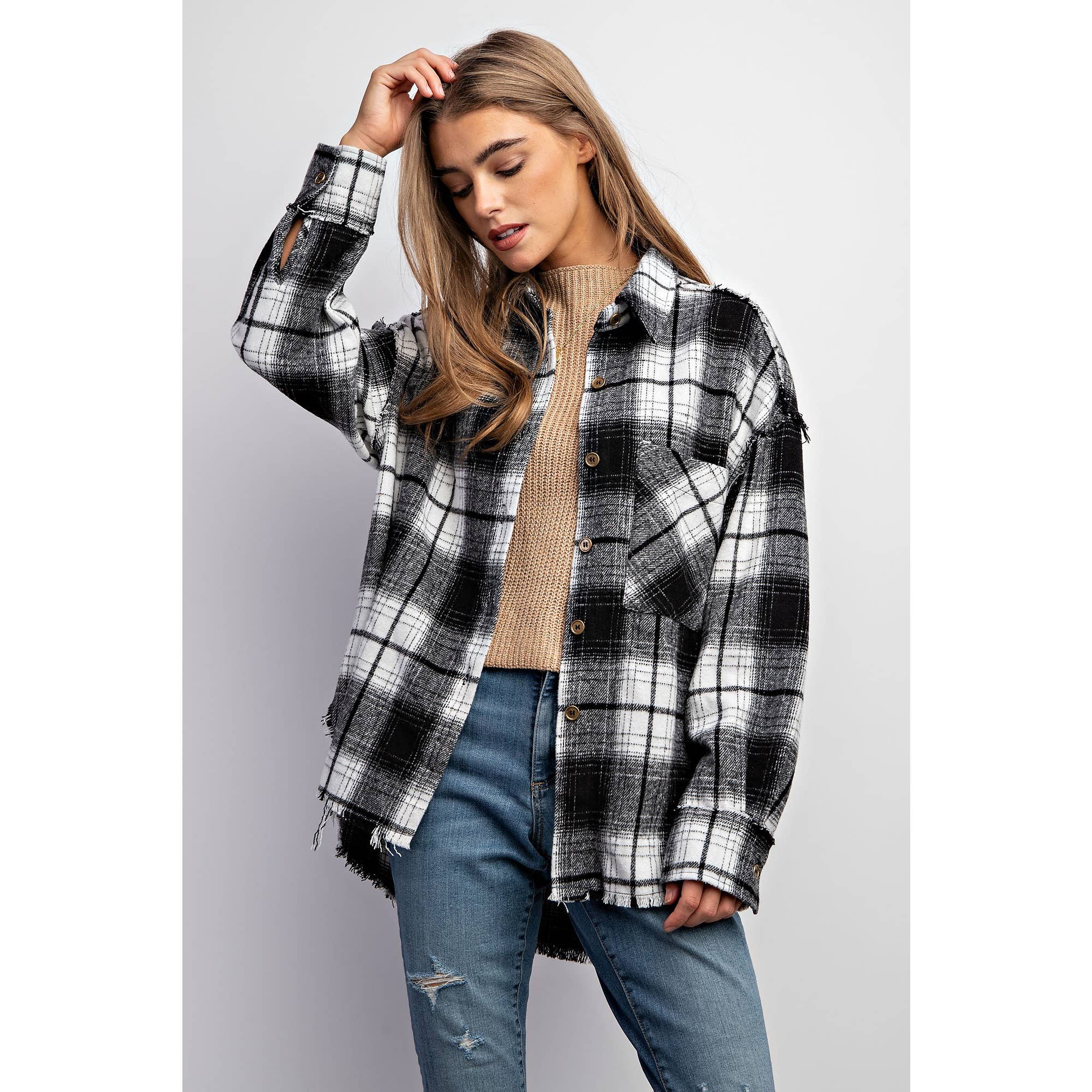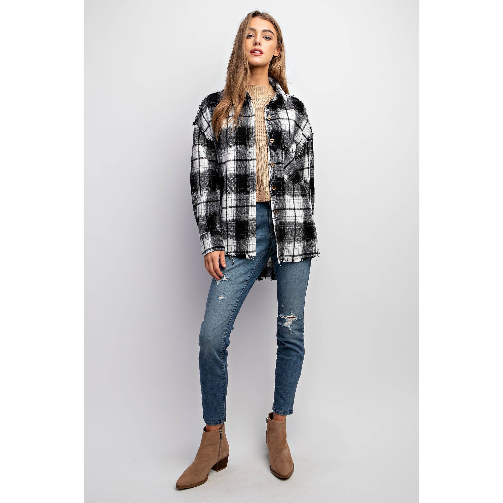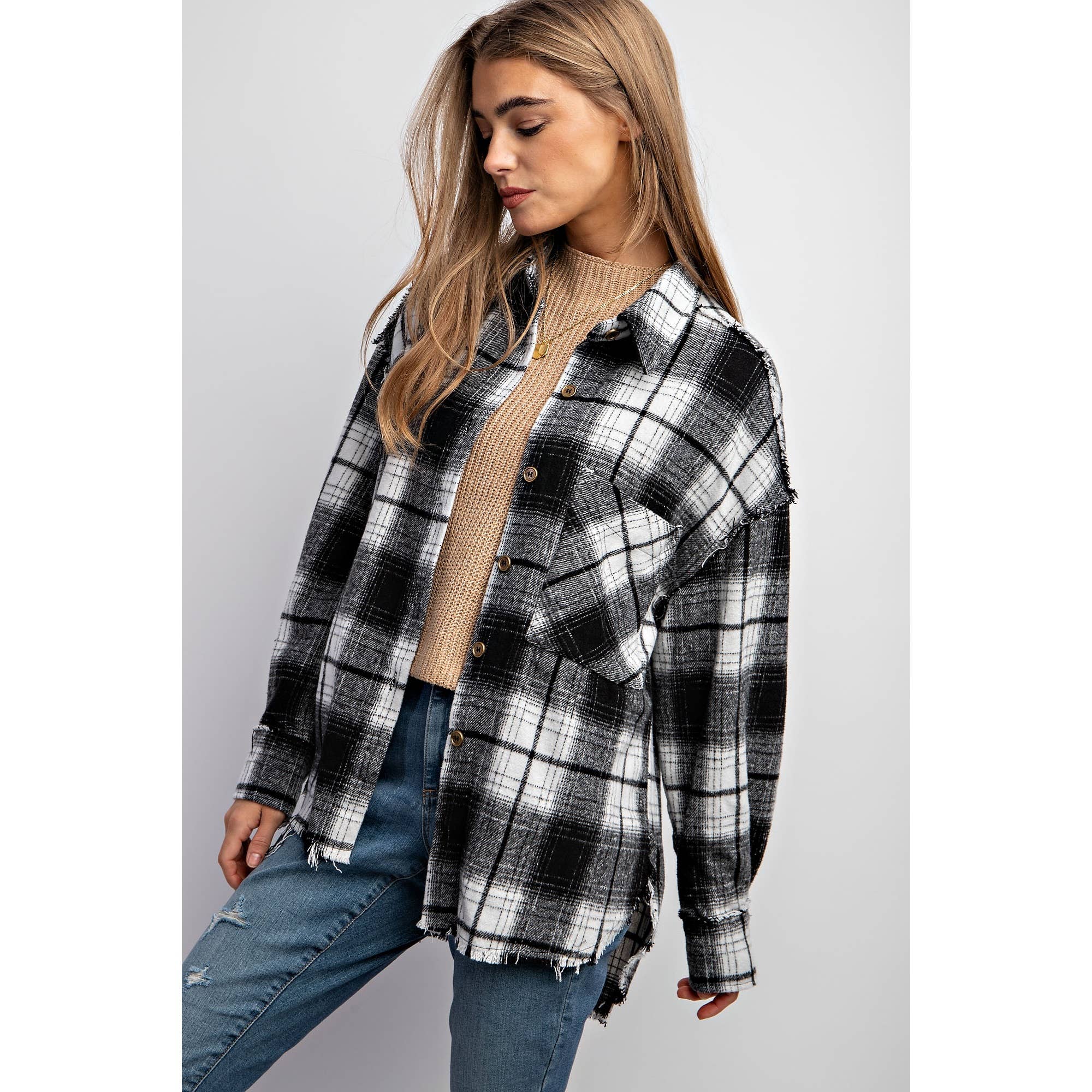Collared button down shirt jacket shacket - Super soft plaid fabric - Front big pocket - Rough edge finishes on seamlines all over the body - Model is 5' 9" 32-24-34 and wearing a Small