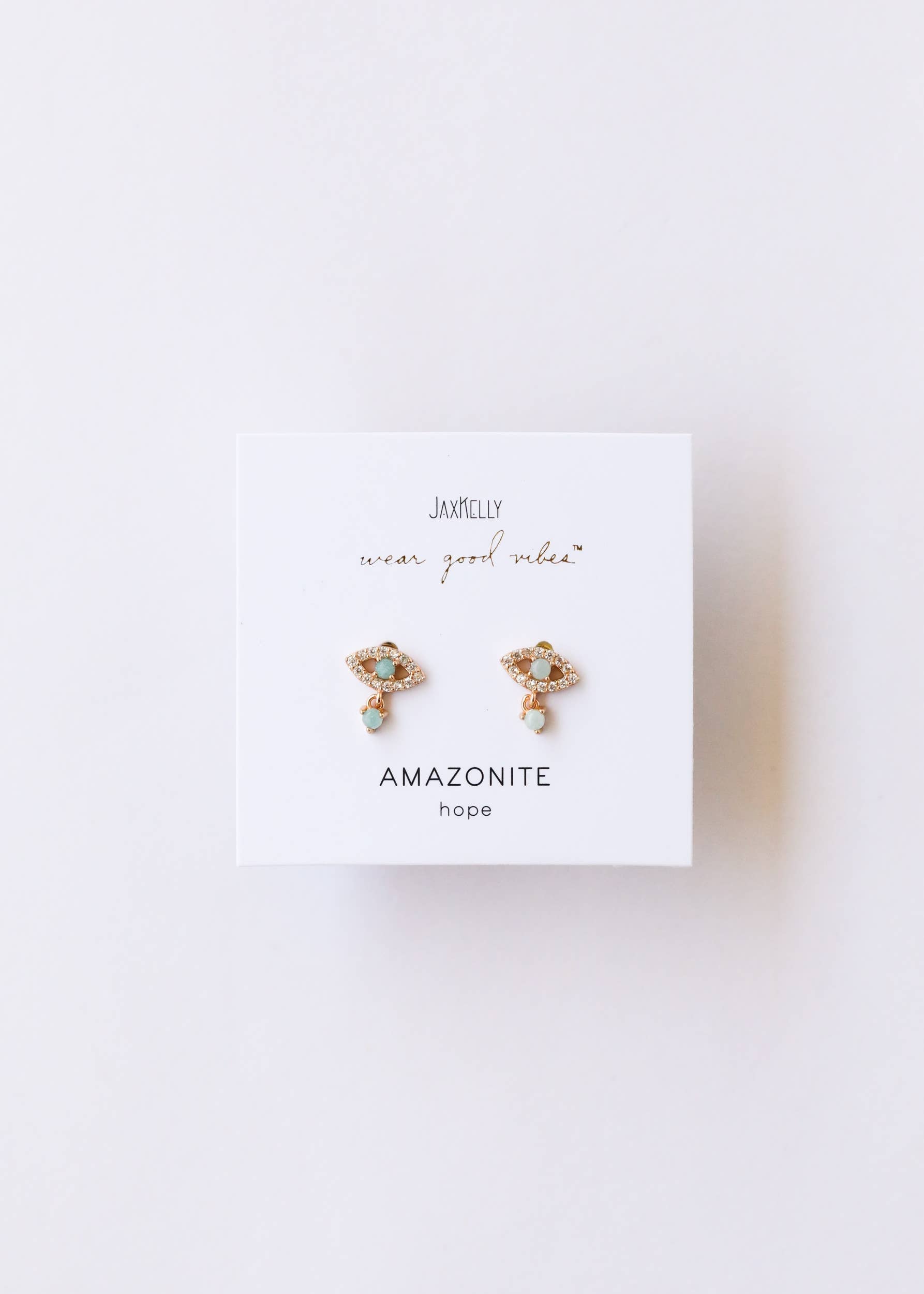 A CZ-encrusted evil eye stud has a petite gemstone hanging from the center.
