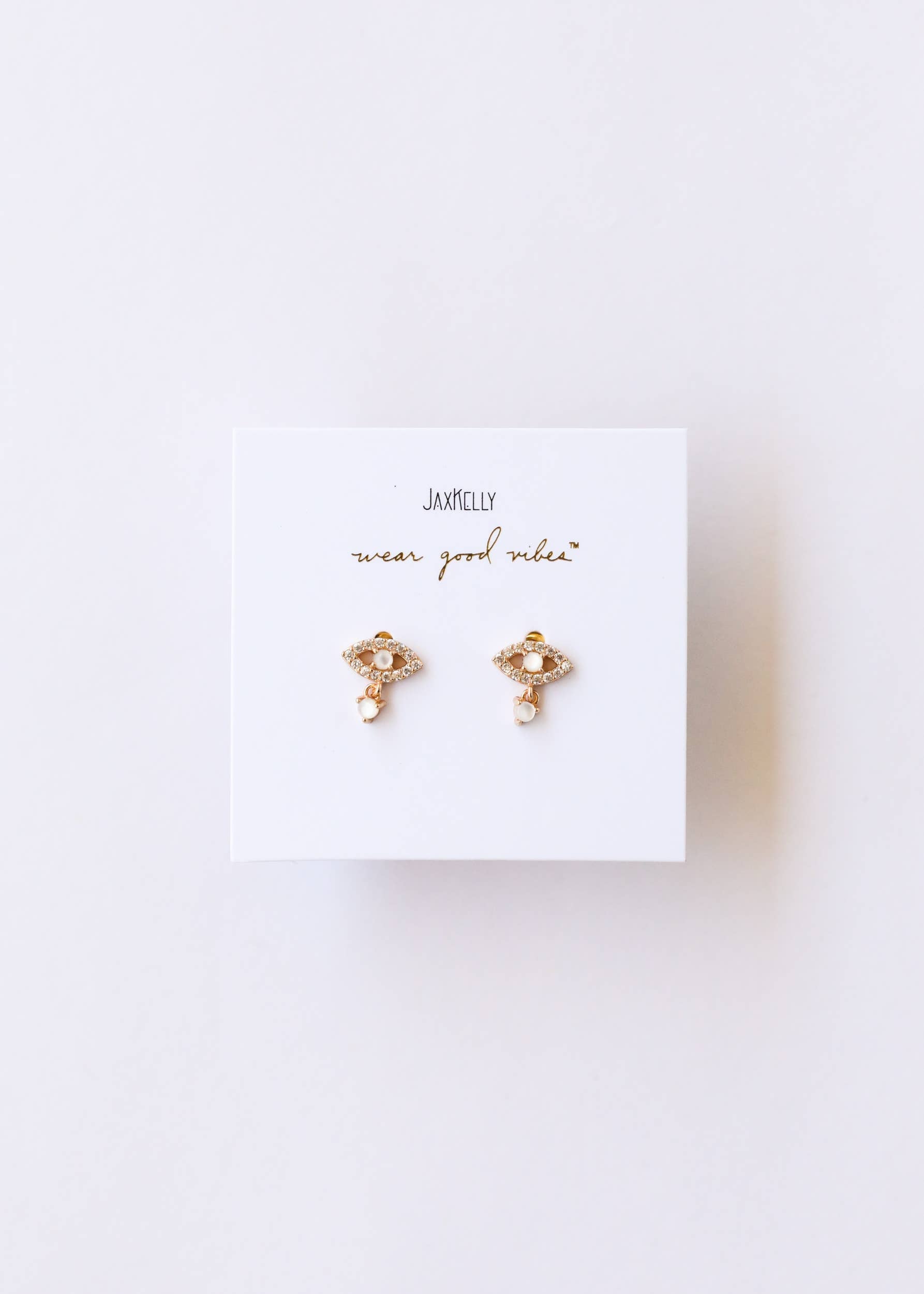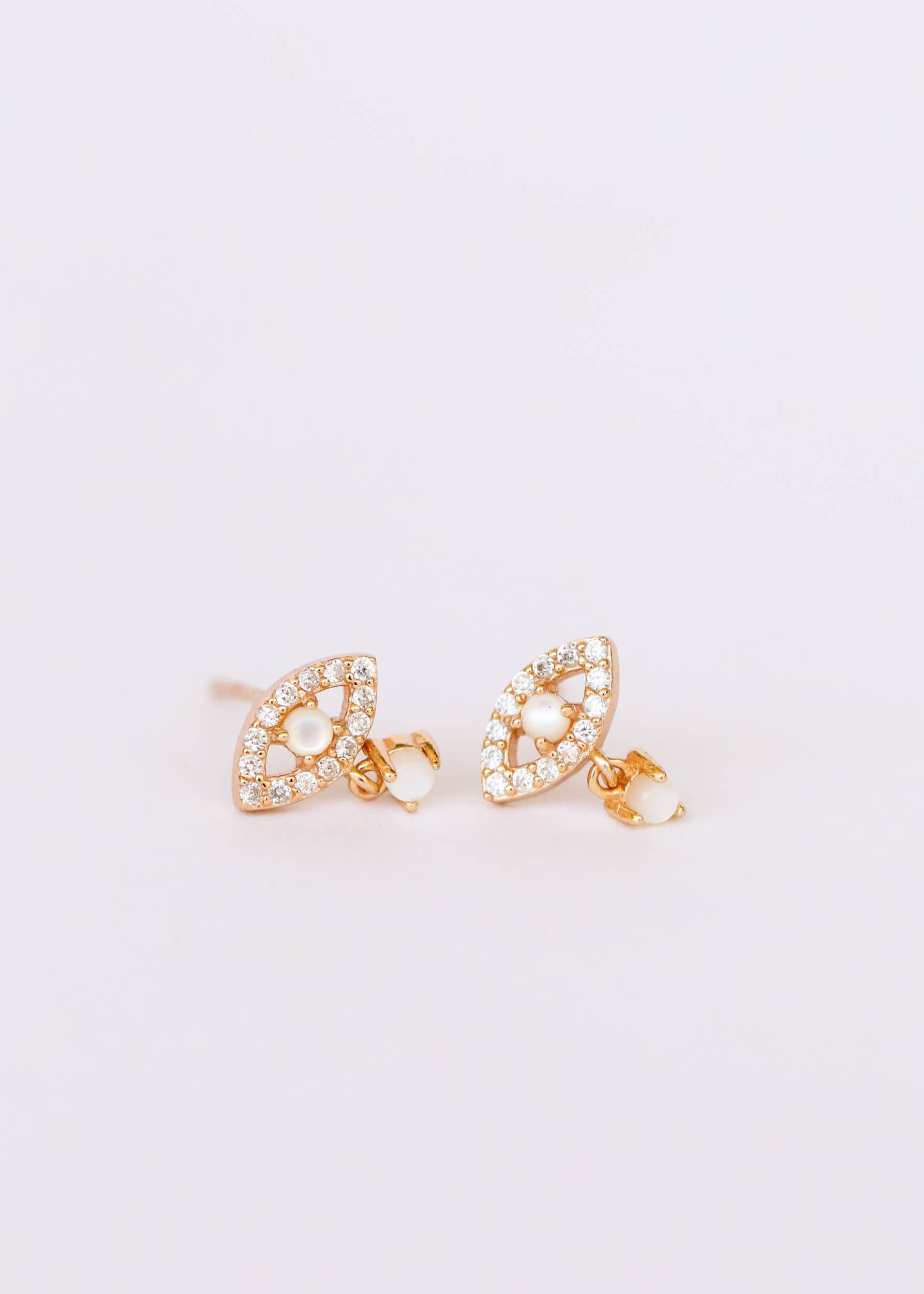 A CZ-encrusted evil eye stud has a petite gemstone hanging from the center.