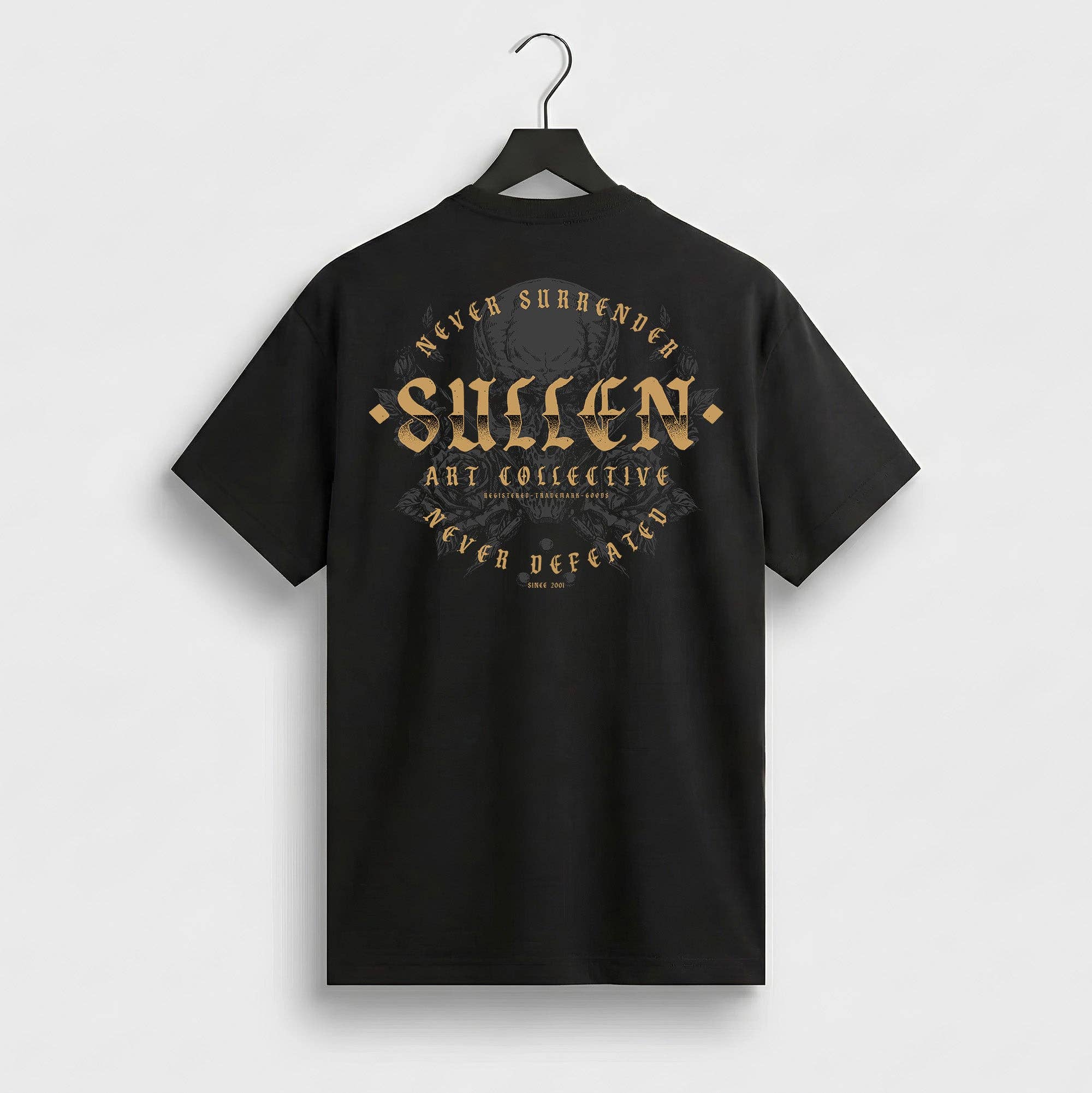 Stacked gold type with artwork lurking underneath. Never Defeated is built for the ones who keep swinging our premium tees.