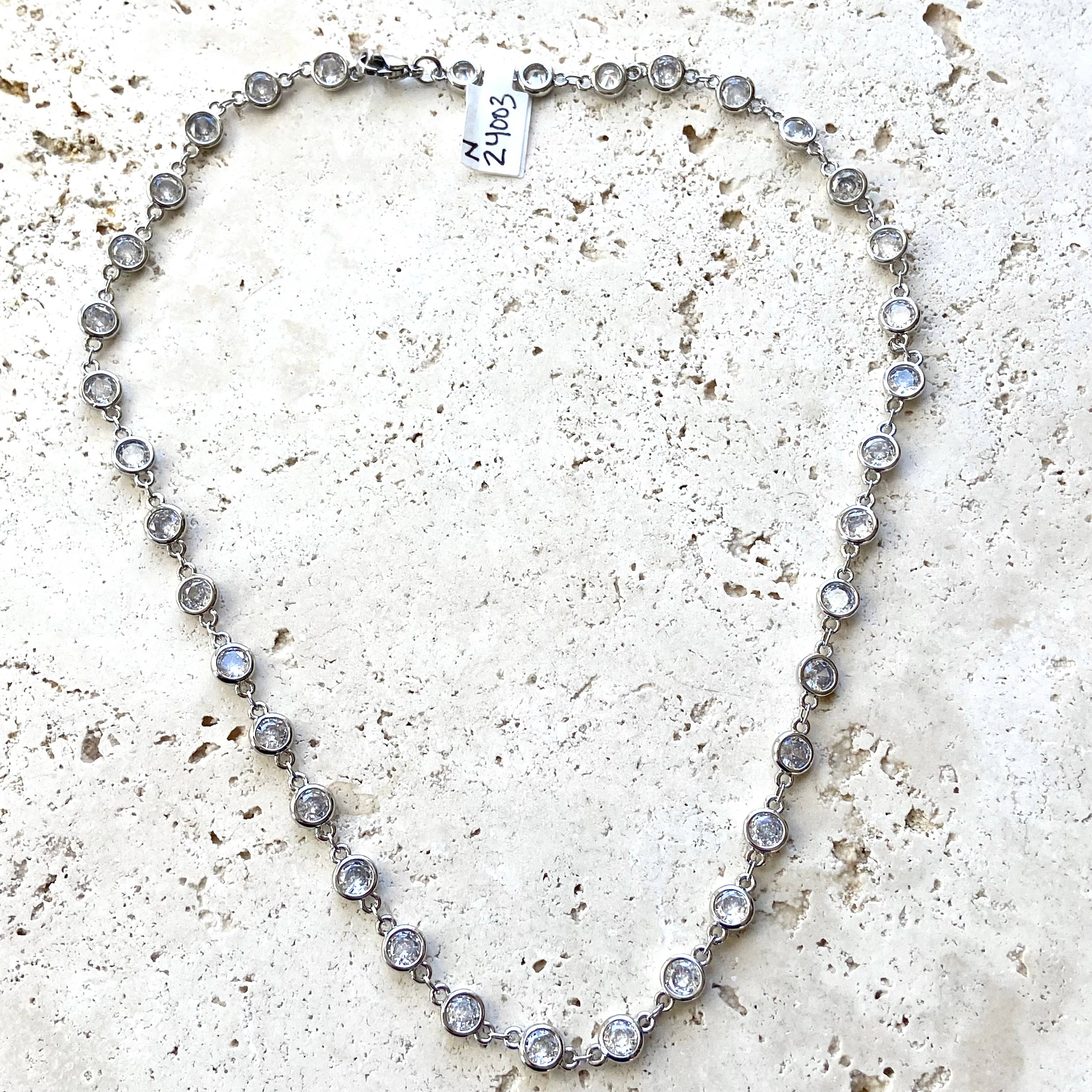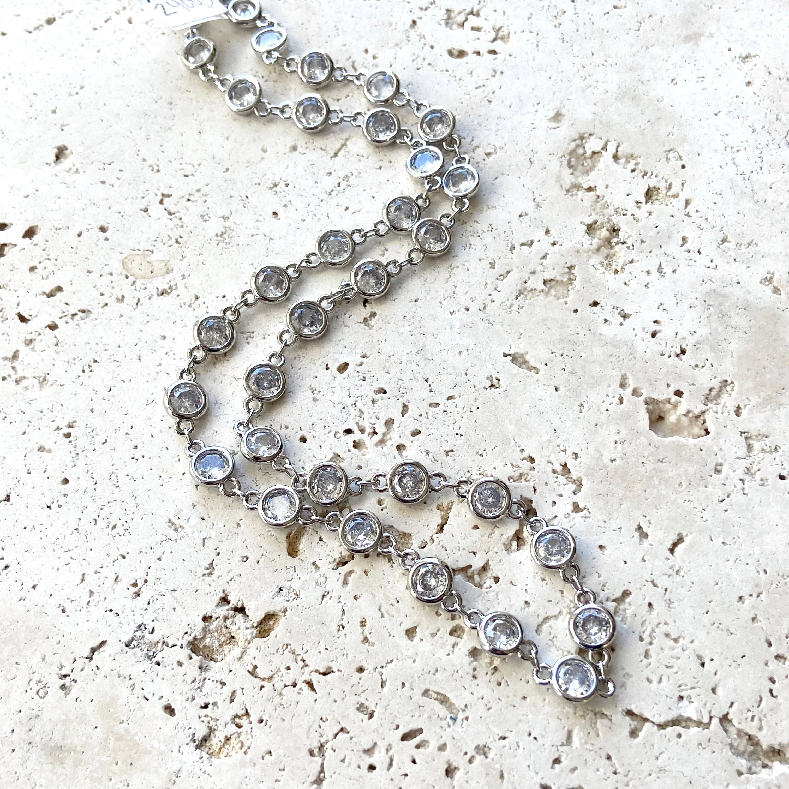 This necklace is so sparkly and you can wear it by itself or layer it up! This necklace features clear crystals on silver chain. Approx.18"