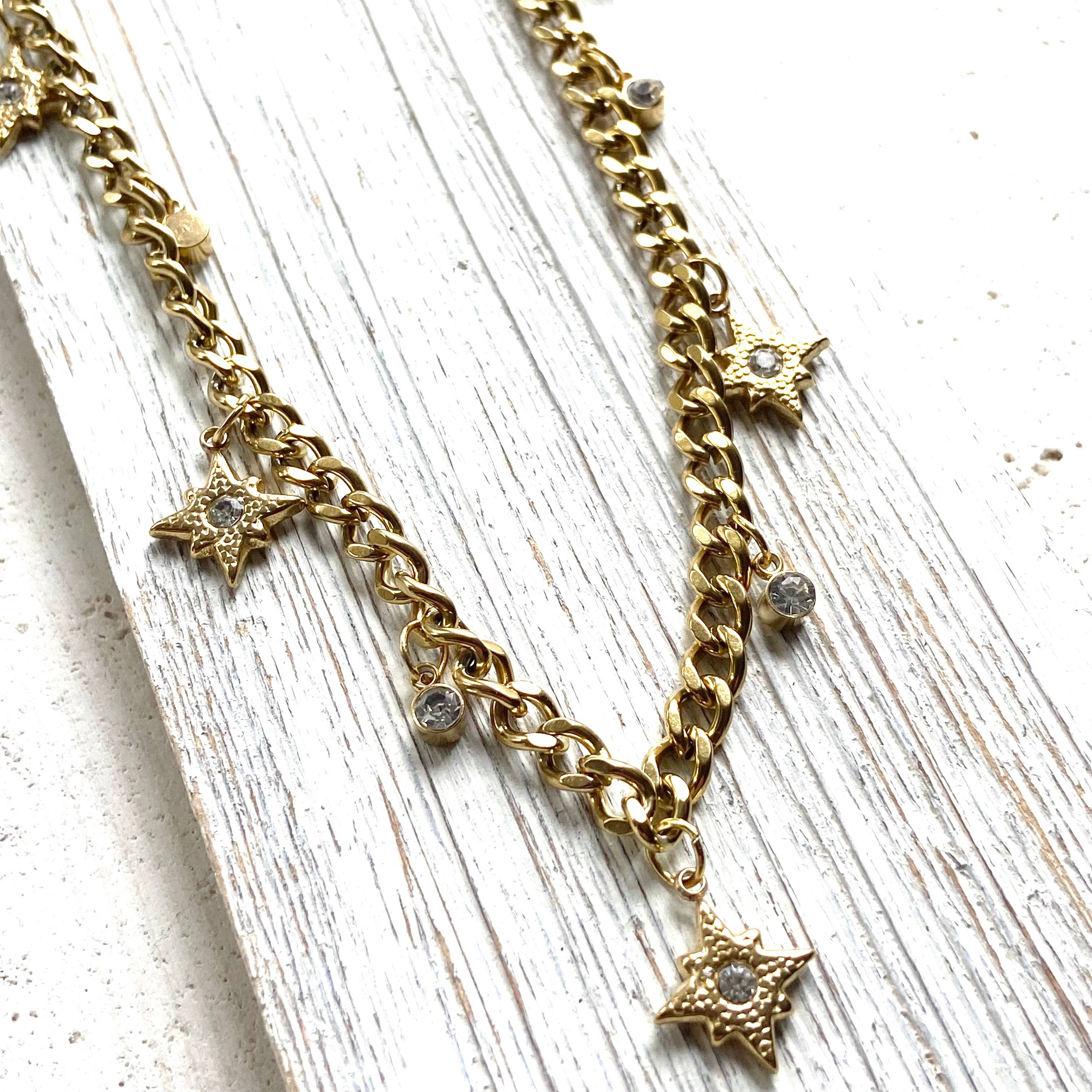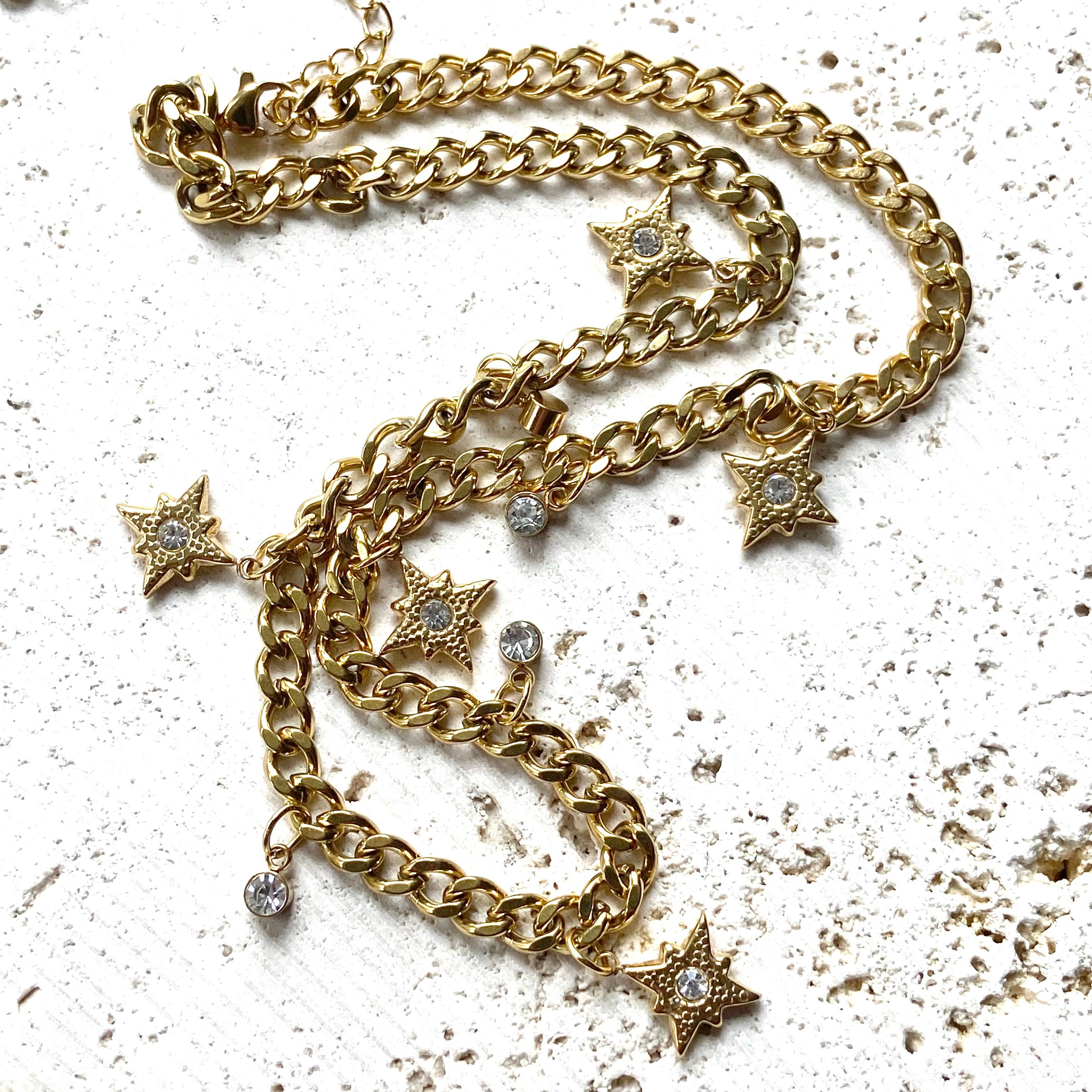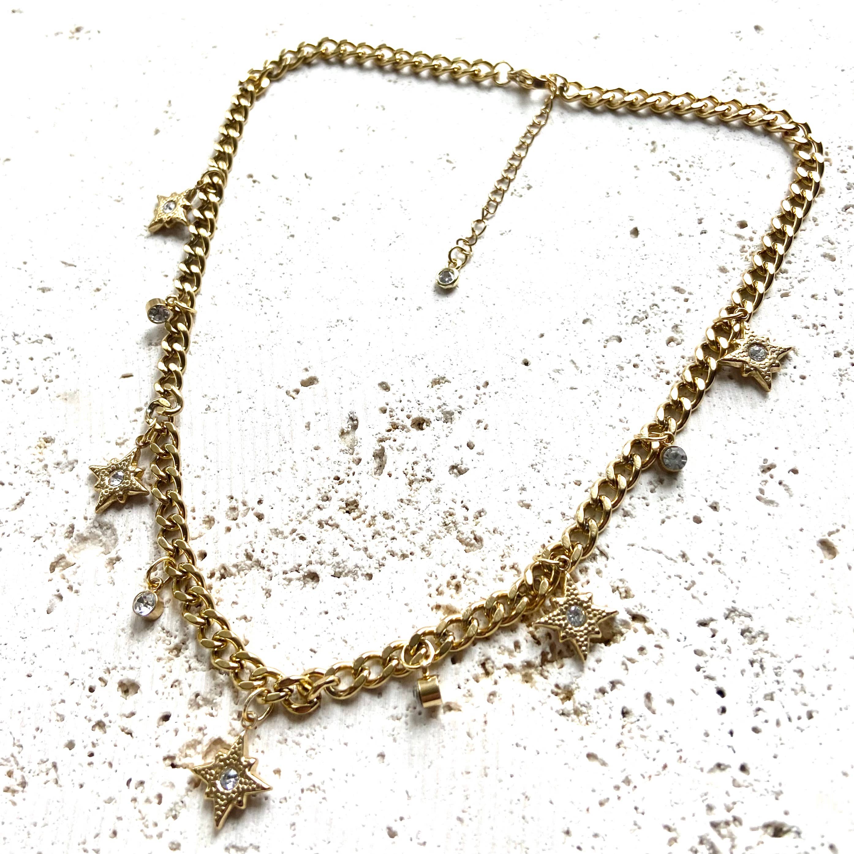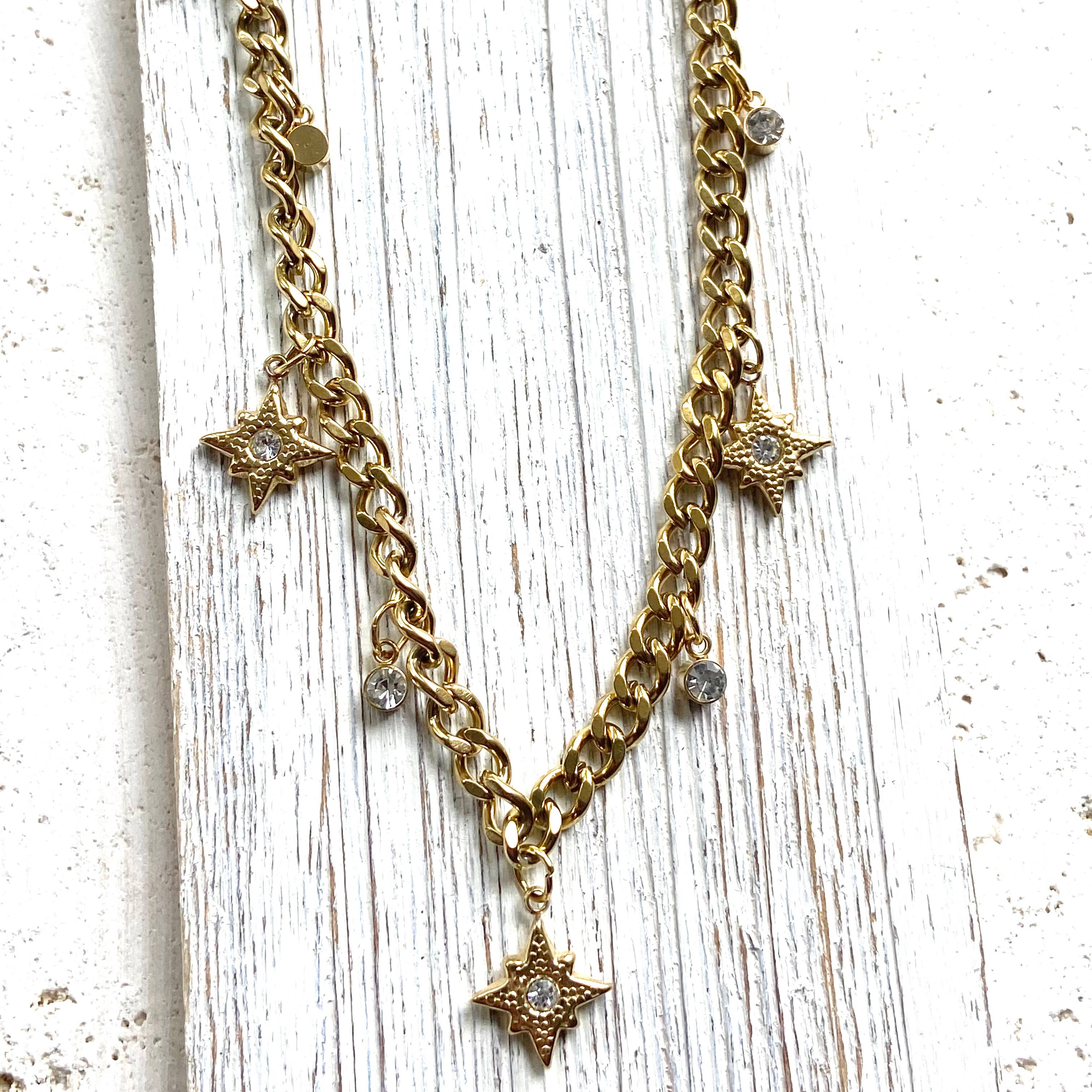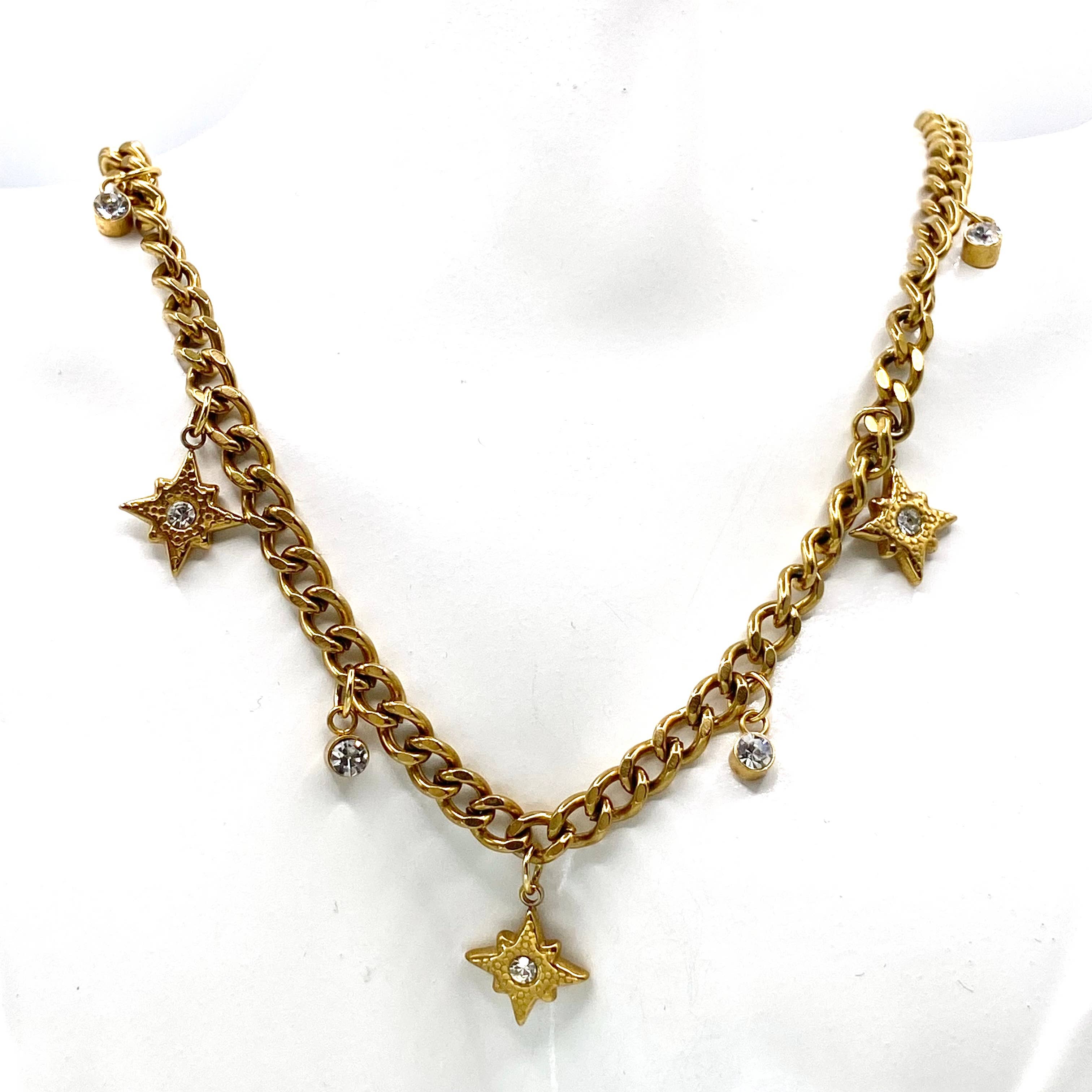 THis charm necklace Is so pretty and easy to style with just about anything! Wear It alone or layer it up. Made with non tarnishing gold plated stainless steel Cuban chain. There are beautiful tiny clear crystal starburst charms.
