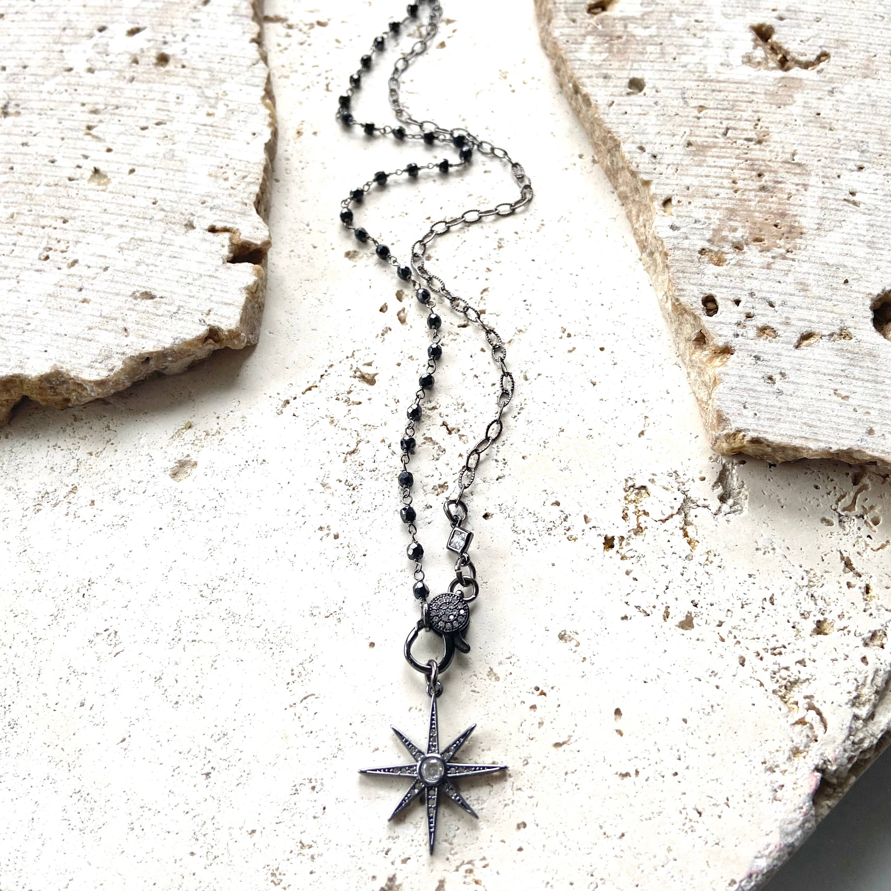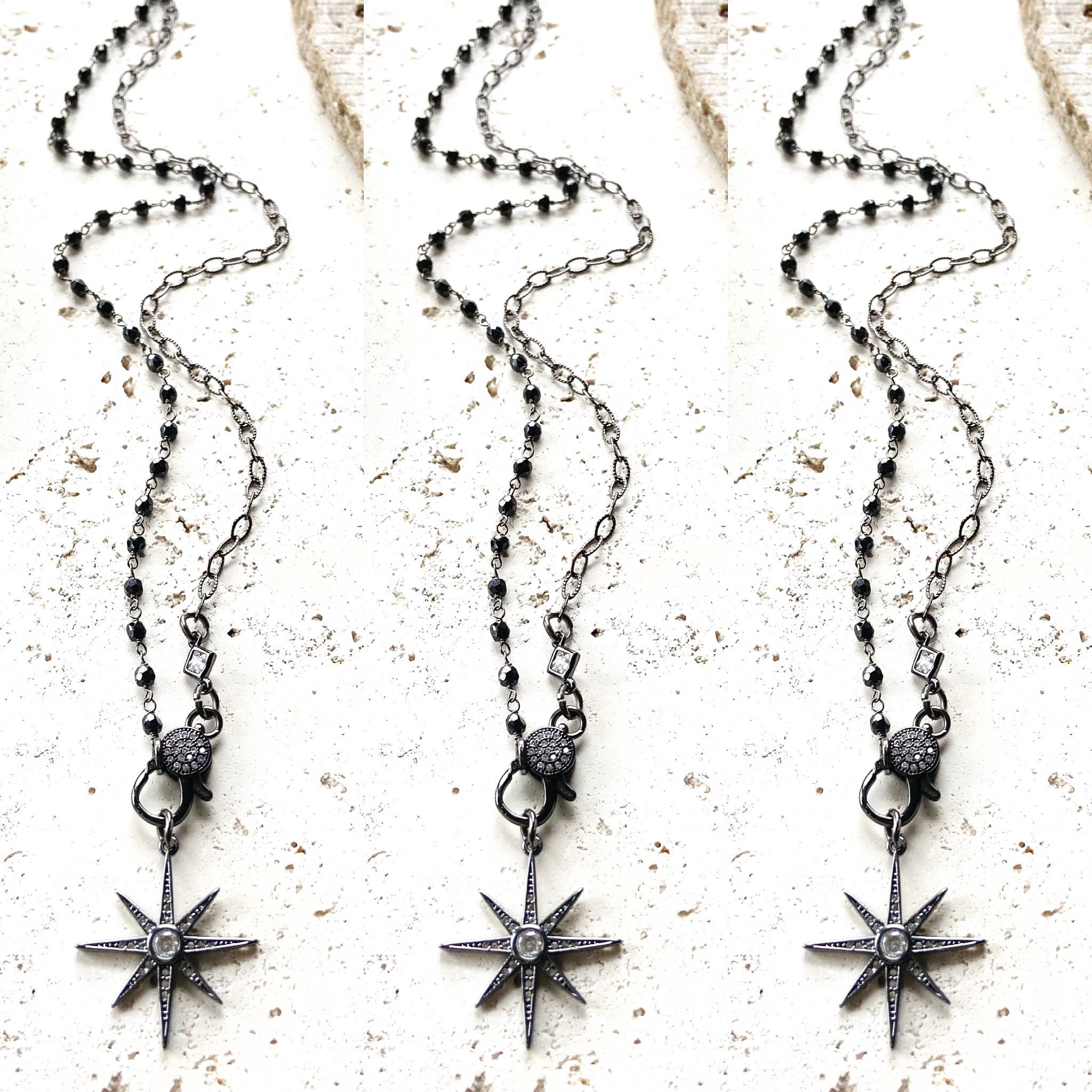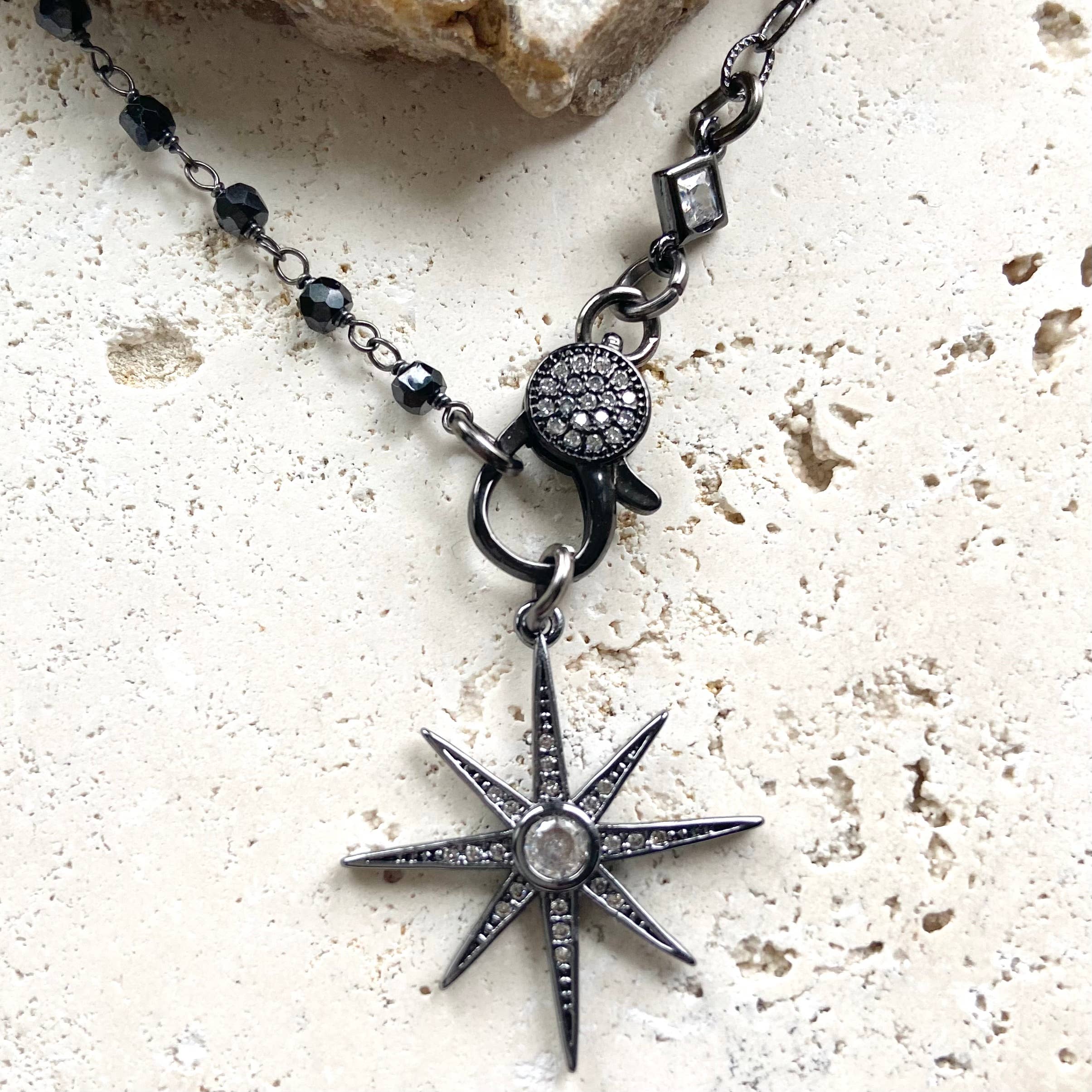 How cute and sparkly is this edgy glam necklace? You can wear it dress up or with your favorite pair of jeans! Very sparkly black faceted crystals hematite chain. Gunmetal clasp and removable starburst 25” pendant. Choose your length.