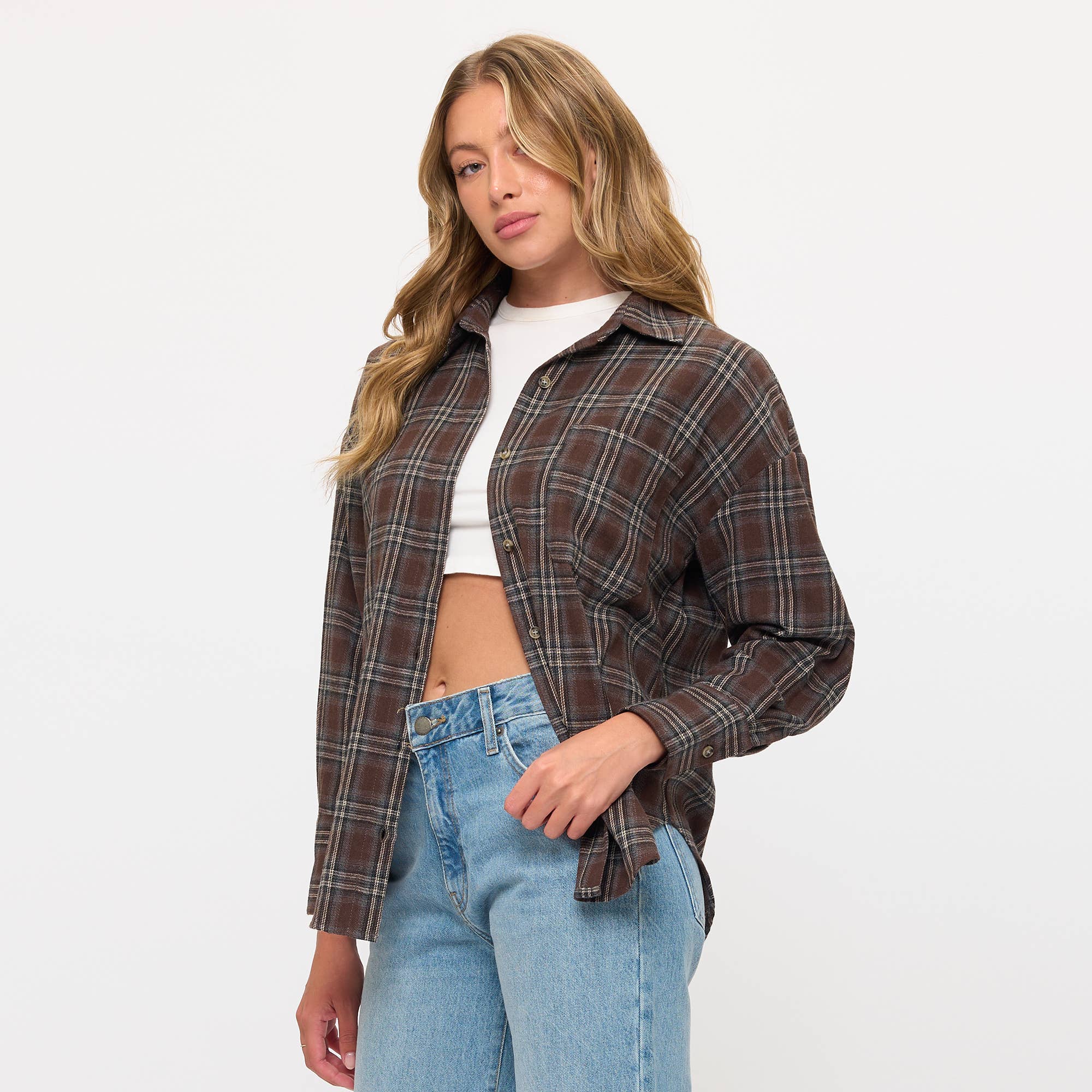 Features: Soft brushed flannel fabric, Classic plaid pattern, Button-down front closure, Relaxed/slightly oversized fit, Drop shoulders for a casual silhouette, Chest patch pocket, Perfect for layering or wearing solo