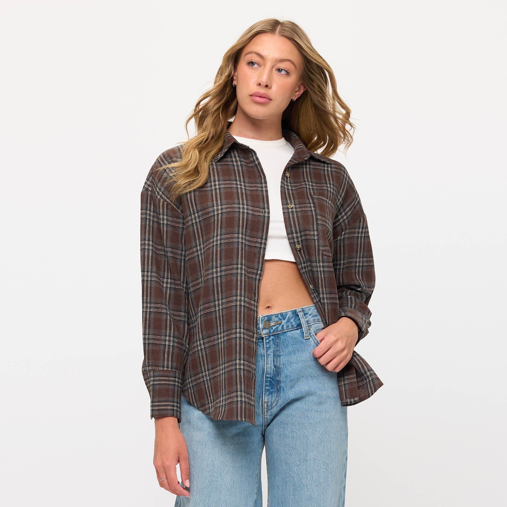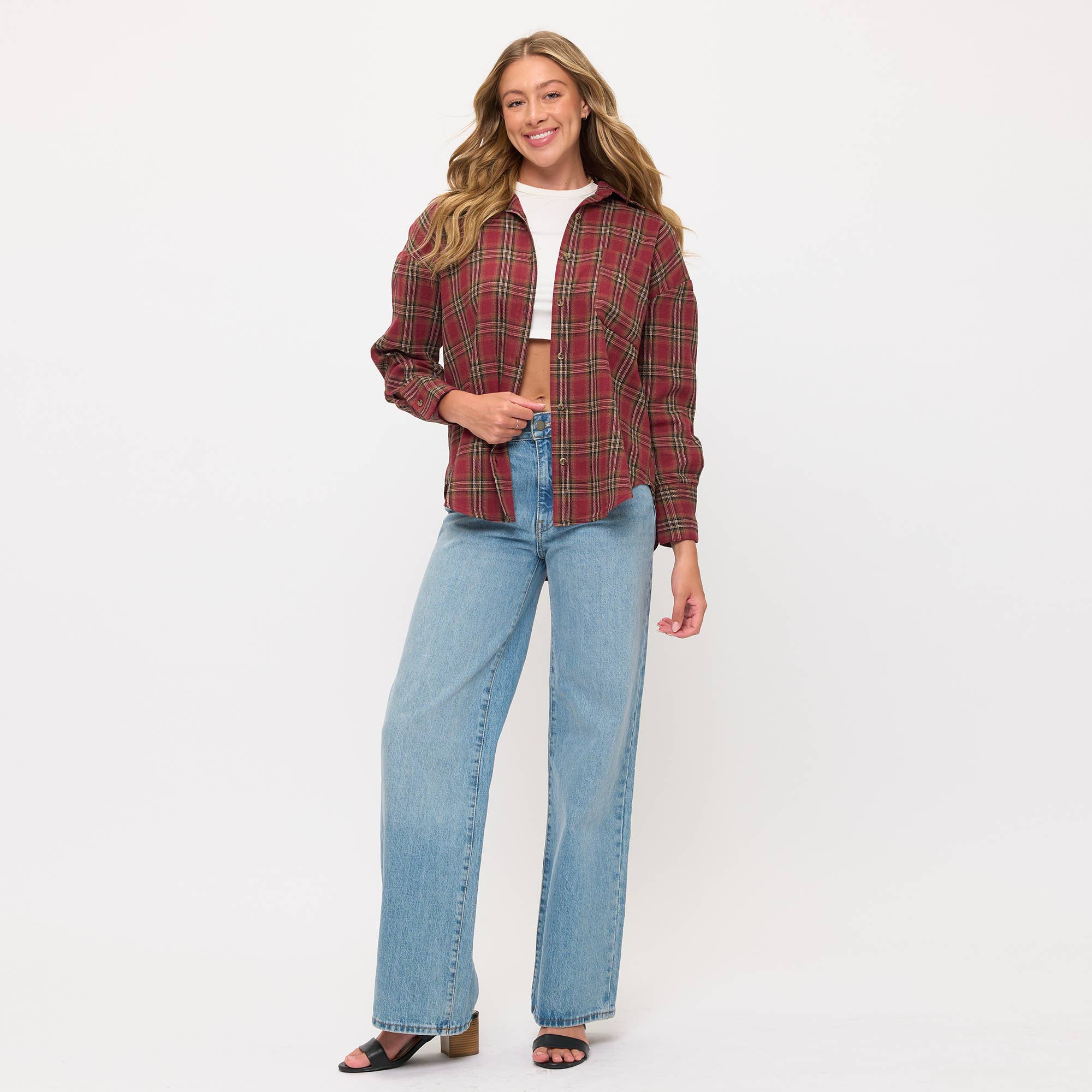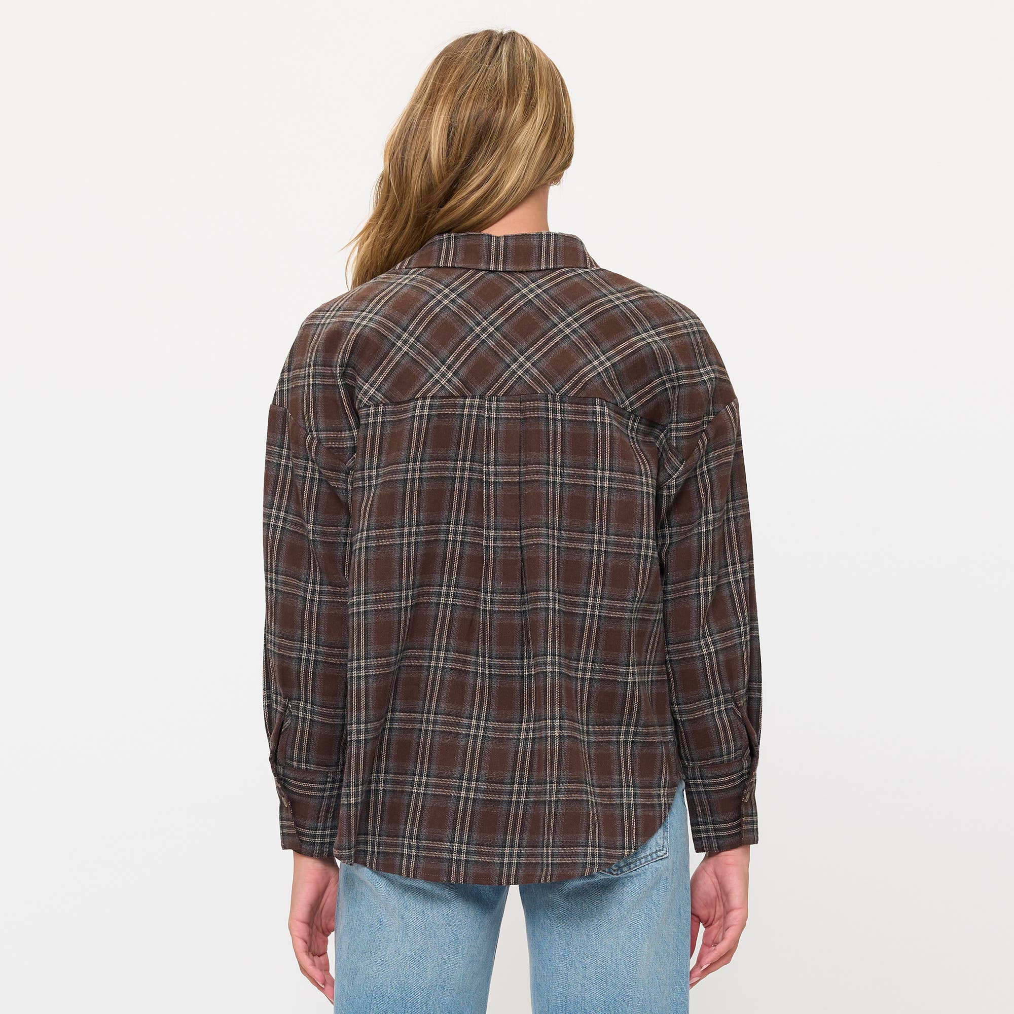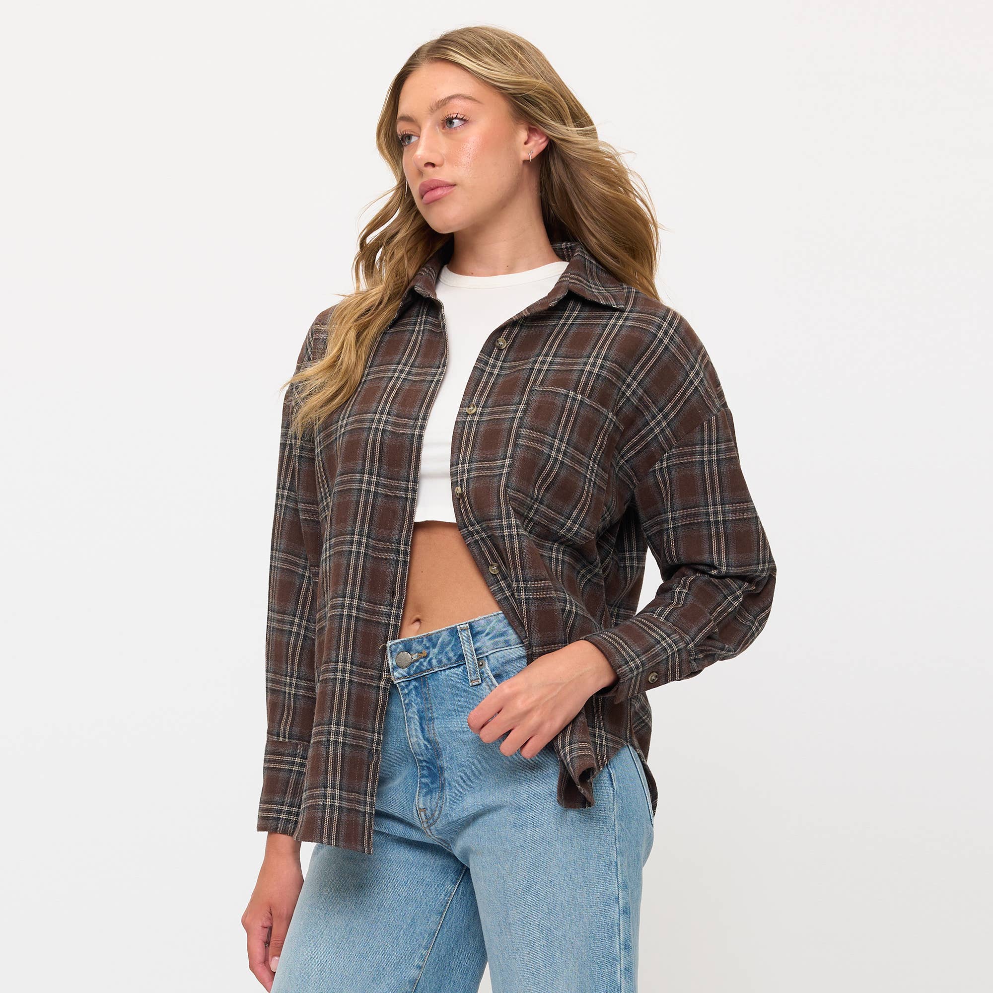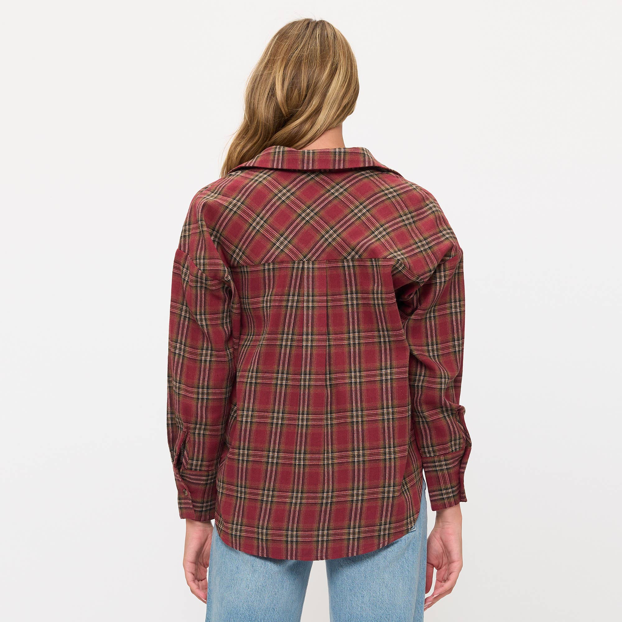 plaid flannel shirt, button-up overshirt, fall layering top, brown plaid shacket, red checkered shirt, casual women's outerwear, trendy flannel jacket, brushed plaid shirt, boutique fall fashion, relaxed fit flannel