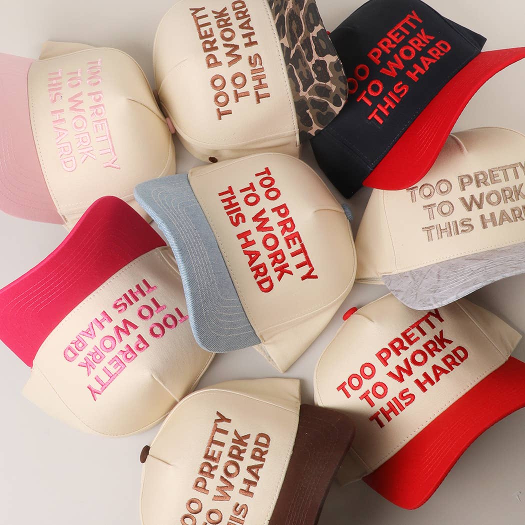 TOO PRETTY TO WORK Embroidery Trucker Hat - TOO PRETTY TO WORK THIS HARD Lettering Logo Embroidery - 5-Panel Two-Tone Trucker Hat - 100% Cotton Canvas Hat - Embroidered In the USA - Base Cap by CC ** One size fits most: Adjustable snapback closure ** Make a bold statement with the “TOO PRETTY TO WORK THIS HARD” cap. Featuring eye-catching embroidery across the front, this playful and confident design pairs perfectly with casual outfits. The cap is made from durable material and designed with a structured front panel, curved brim, and adjustable back strap for a comfortable fit. Offered in a variety of lively color combinations — including leopard print, denim, and vivid contrasts — there’s a style for every personality. Whether you're dressing up for errands or a casual hangout, this cap adds a fun, empowering touch to any look.