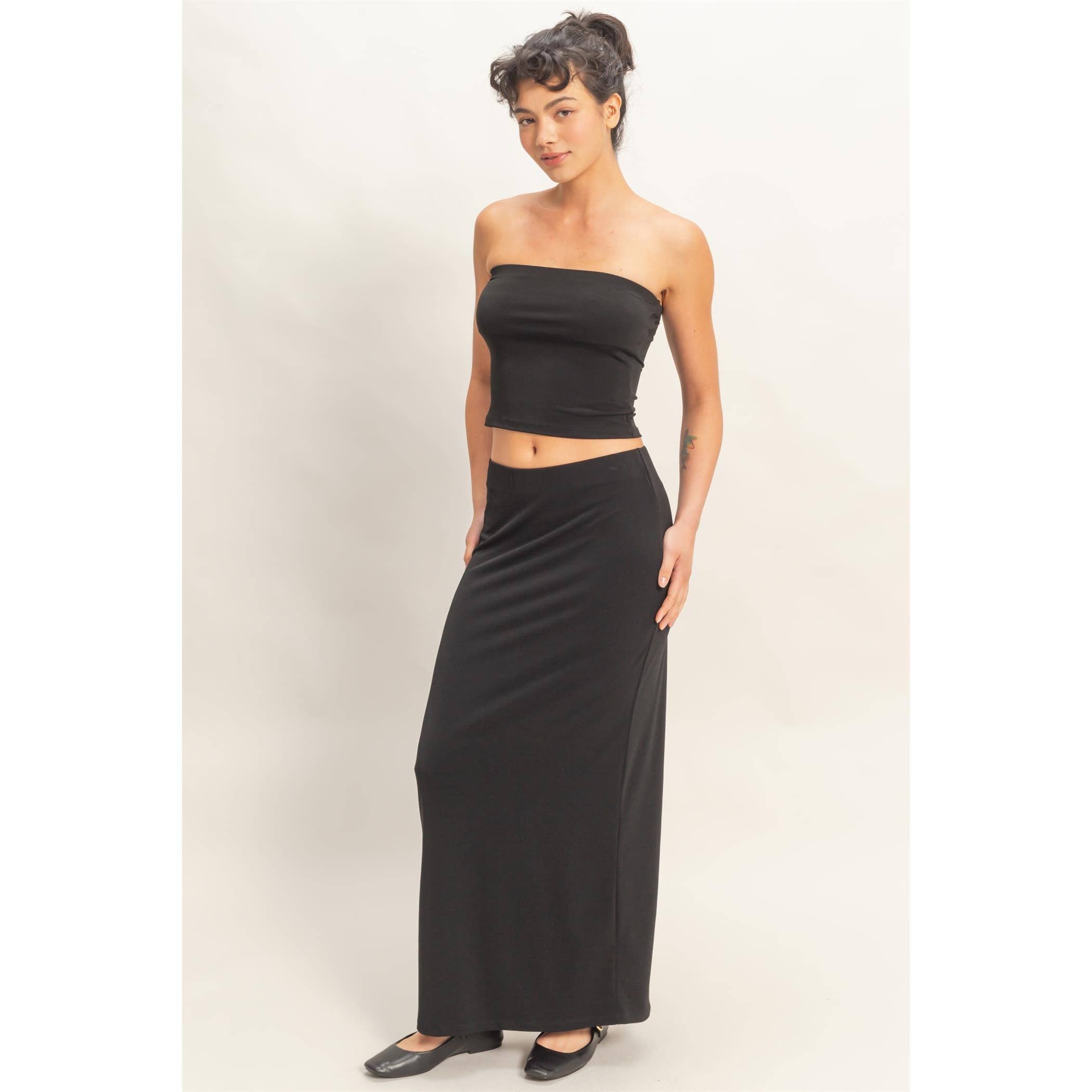 Define your silhouette with this two-piece set. The tube top features a secure strapless neckline with internal elastic. The maxi skirt highlights an elastic waistband and a sleek, streamlined drape. Style with a denim jacket and chunky sandals for a versatile look. 95% Polyester 5% Spandex Model Is 5' 7" Tall, 32" Chest, 25" Waist, 36" Hips And Wearing A Size Small Imported. Designed In The USA