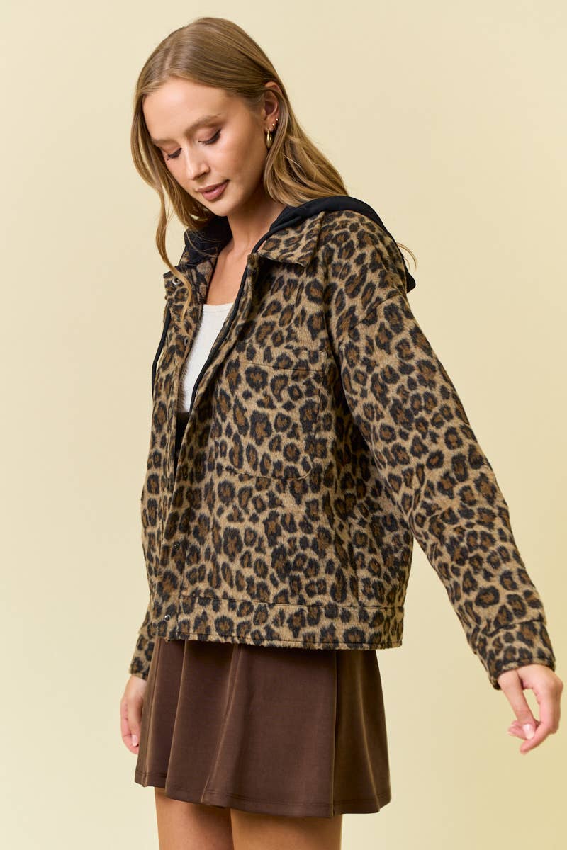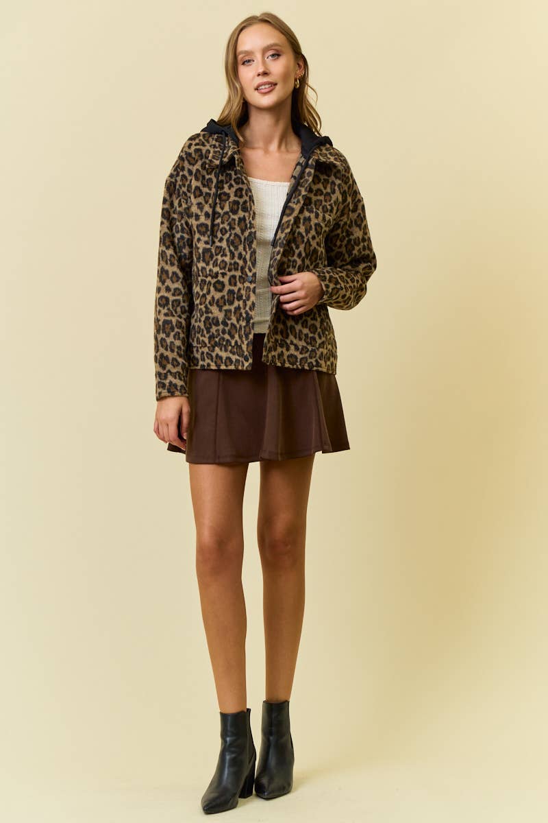 LEOPARD HOODIE JACKET - Stylish leopard print hoodie jacket, available in both brown and grey colorways. - Features a cozy hood in solid black with adjustable drawstrings for versatile wear. - Front snap button closure for easy layering and a secure fit. - Soft, textured outer fabric for comfort and warmth in cooler weather.