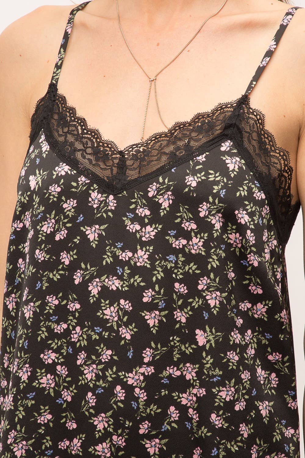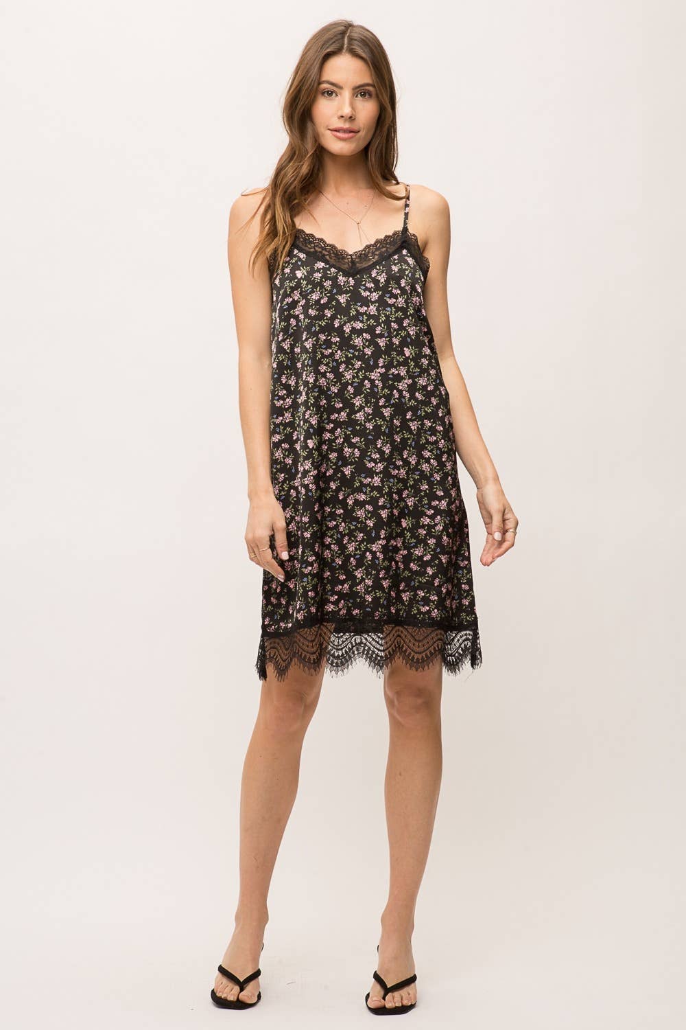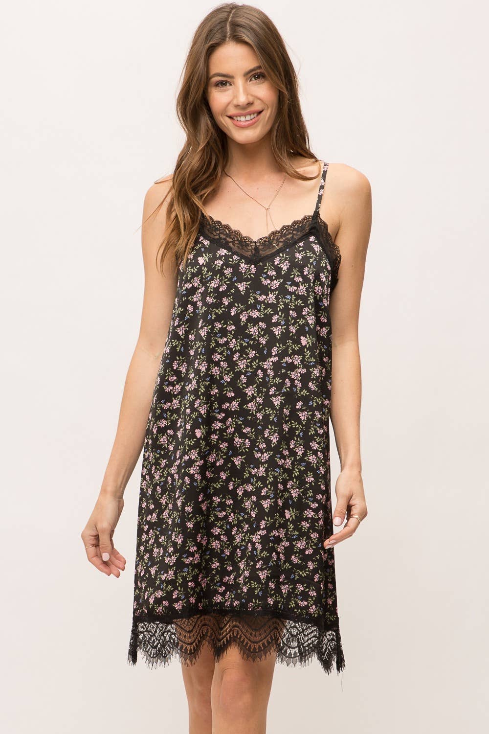 Floral satin slip dress with scallop lace Lace hem Adjustable straps -100% Polyester