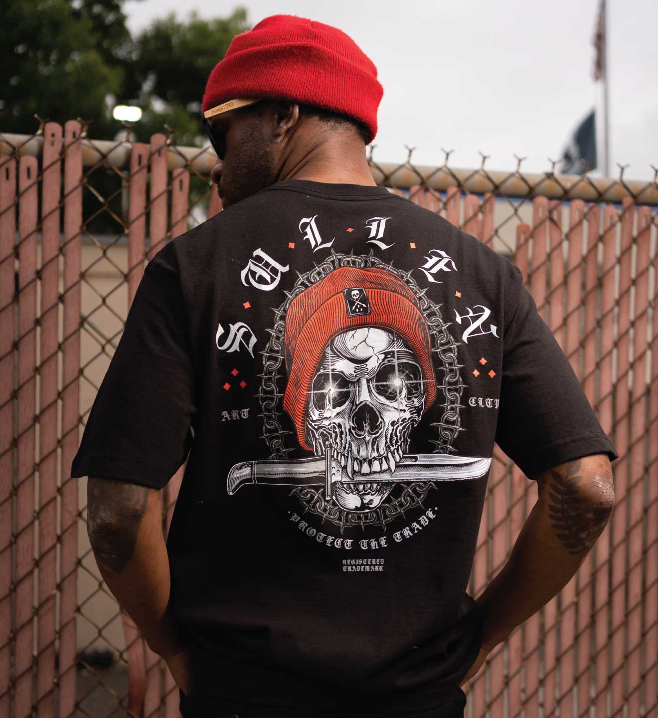 Posted up in a red beanie and steel in his teeth, this guy's not here to play lookout. Printed big on the back of our classic standard tee, this one's for the bros who get in, get out, and don't flinch.